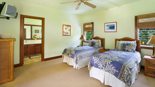 Ahe Lani is a delightfful house in a secluded garden setting but just steps from Baby Beach. The island decor is charming and the rooms are spacious. Both bedrooms have ensuite bathrooms with double sinks and both have televisions. All three televisions have Roku with many available streaming channels. Koloa is a great location for getting to sights anywhere on the island, Kauai is truly a tropical paradise, and Ahe Lani is a lovely home base.