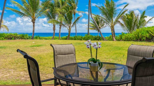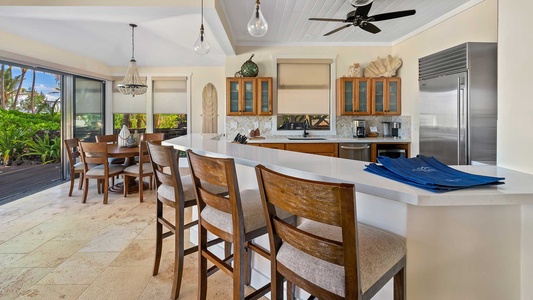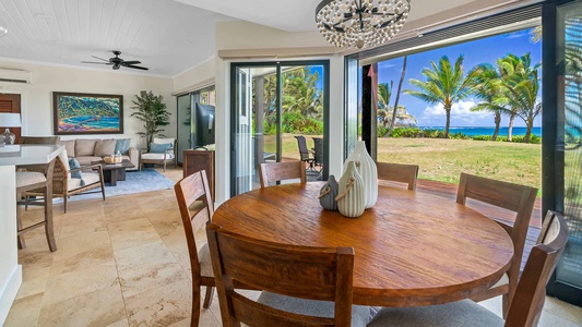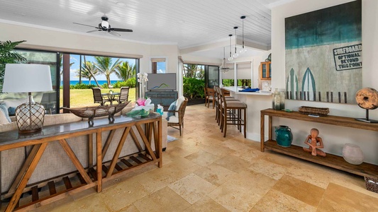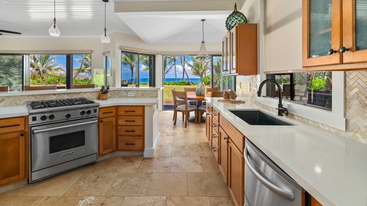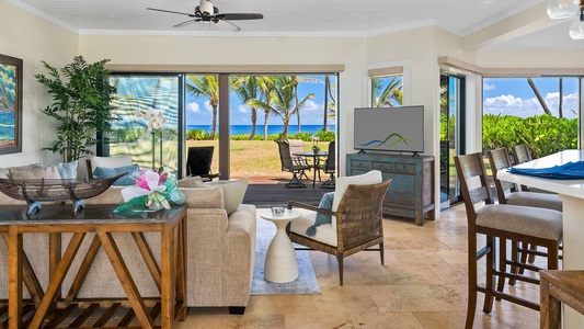 • Great room design – living room with AC, flat screen TV, dining room and gourmet kitchen with ocean views and access to extra large open lanai