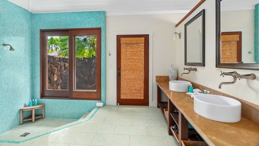 Surrounded by lava rock walls on three sides with an entry gate, one feels tucked away in an island paradise. The spacious living areas offer ocean views from almost every room. The full equipped gourmet kitchen features Sub Zero and Wolf appliances. There are two master suites, as well as an additional two guest rooms, all offering ocean views.
