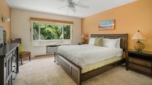 If you are looking for comfort and quiet, this place is for you. It is on the second floor, which is the top floor, so you do not have to worry about any stomping neighbors above. There is a well working AC in the bedroom which is hard to find in Kauai. It keeps the place nice and cool and also helps to drown out the street noise. The condo is very nicely updated so it has a lovely ambiance and was very clean. It overlooks the golf course with the ocean in the distance. During our 11 day stay, there was a nesting Albatross in the golf course across from our window. It was pretty cool watching him every day. We named him Jack. It is also nice that the condo is within walking distance from Hideaway Beach and Queen’s bath because there is little parking at those two spots. We really enjoyed our stay!