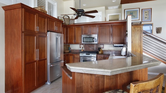 • Stainless steel appliances, granite countertops, breakfast bar in ocean view gourmet kitchen