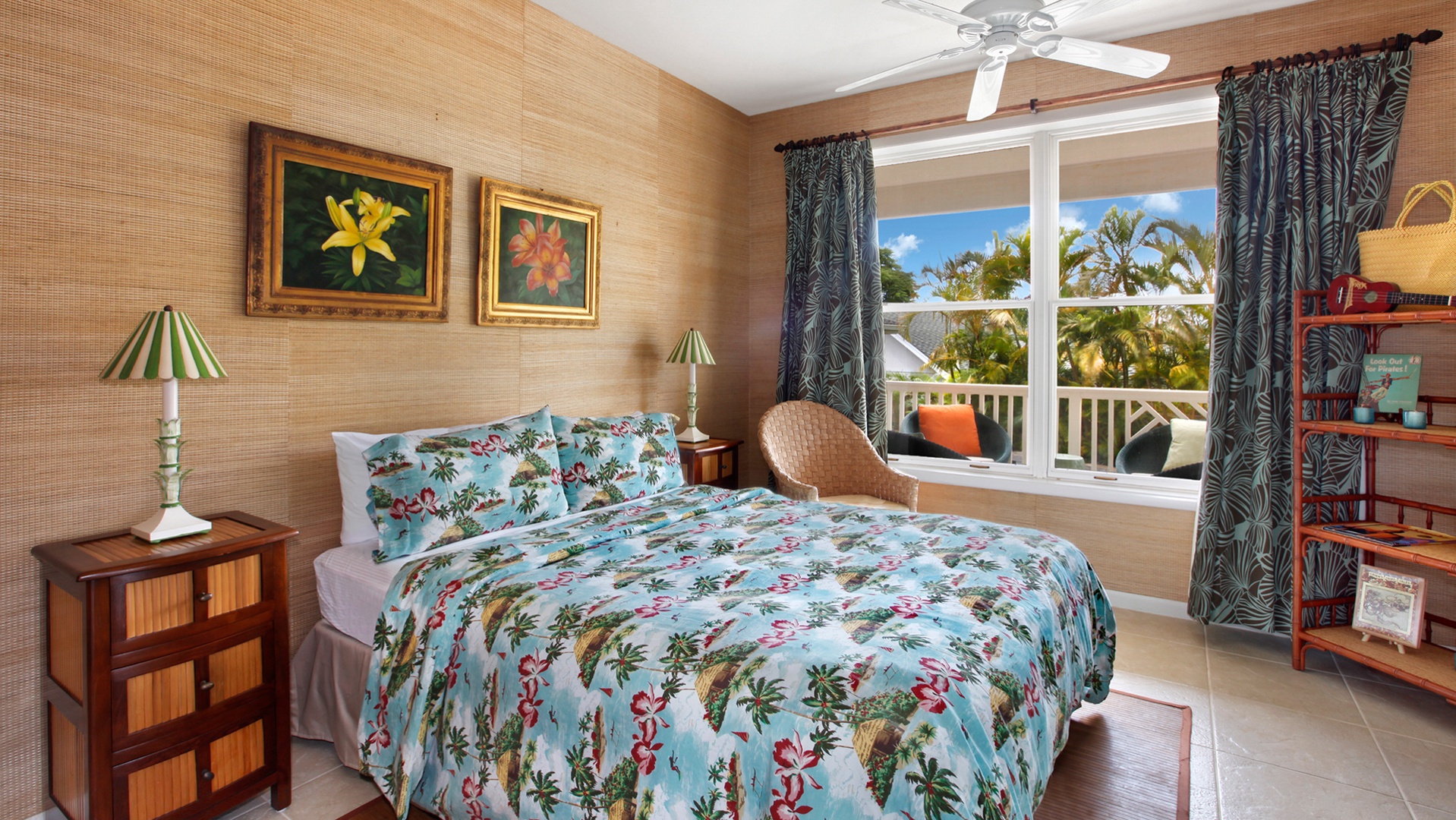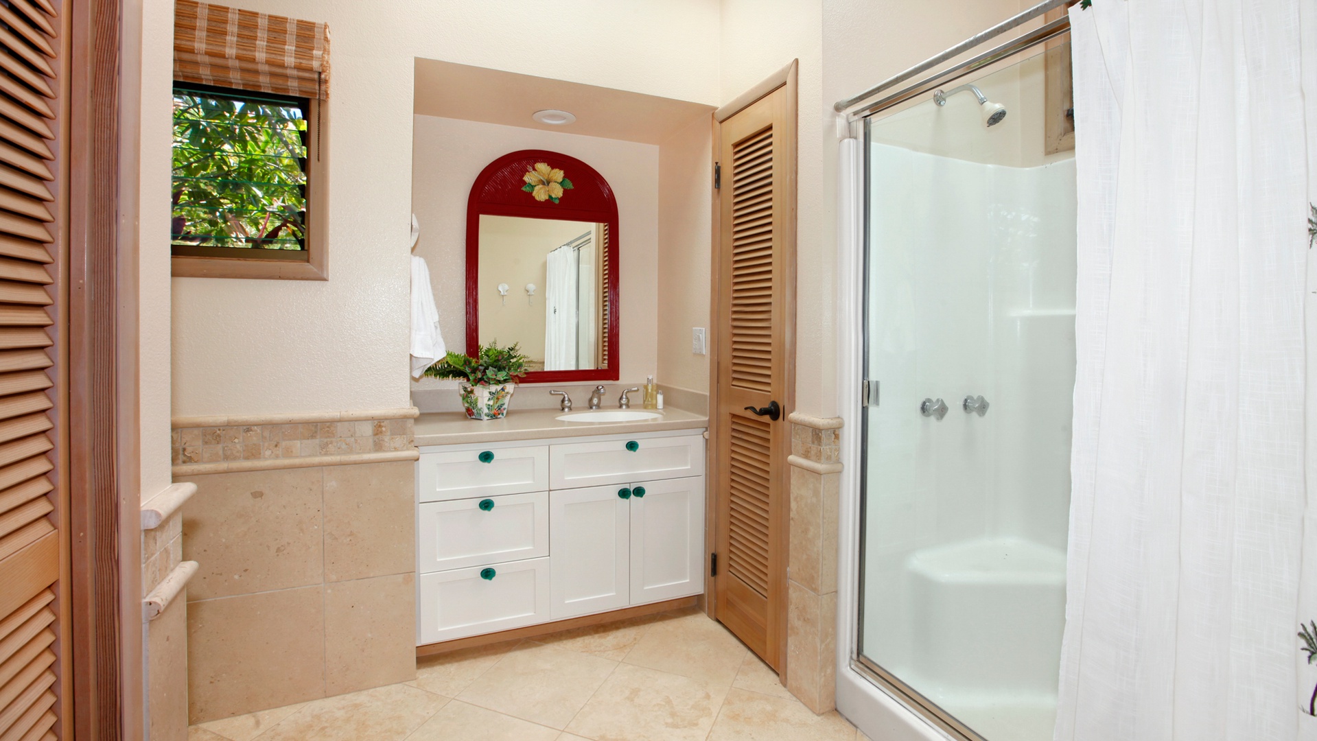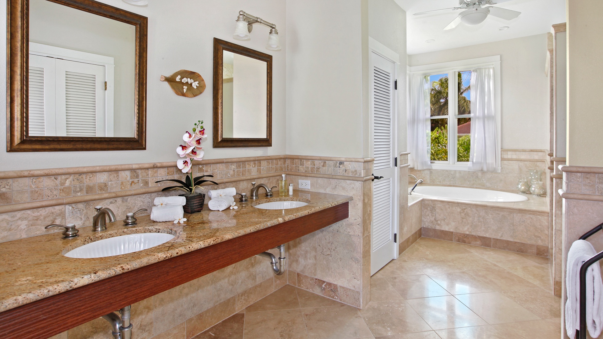 • Master Suite – Upper level, King bed, large walk-in shower with separate tub, TV, large ocean view shared lanai, walk-in closet
