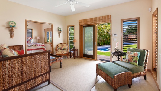 The private L-shaped pool is perfect for keeping cool and enjoying the Poipu Beach sunshine all year round. Hale Aloha Kai is also for the food and cooking enthusiast with a large gourmet kitchen and all stainless appliances and breakfast bar. The separate casual dining area along with the formal dining table for 10 is ample room for all to enjoy the island inspired meals.