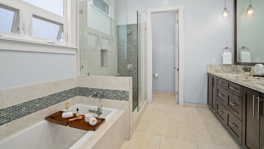 • Primary Bedroom Suite – AC, lower level, king bed, flat screen TV, walk-in closet, full bath, tub and walk-in shower