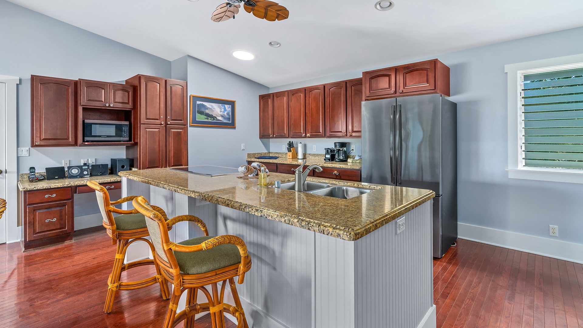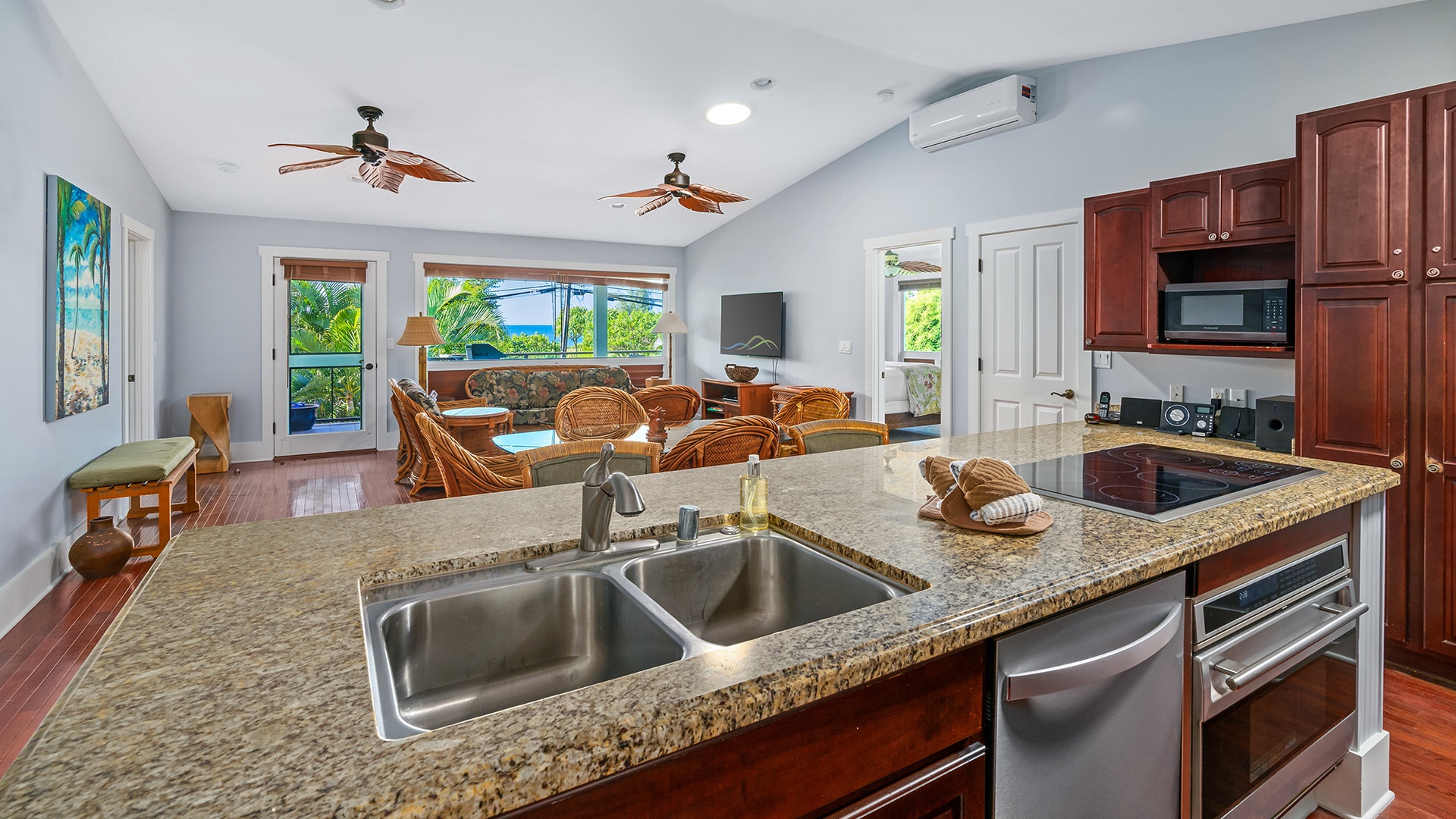 • Great room design – AC, ocean view living room with access to covered lanai for outdoor dining and gourmet kitchen