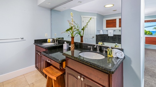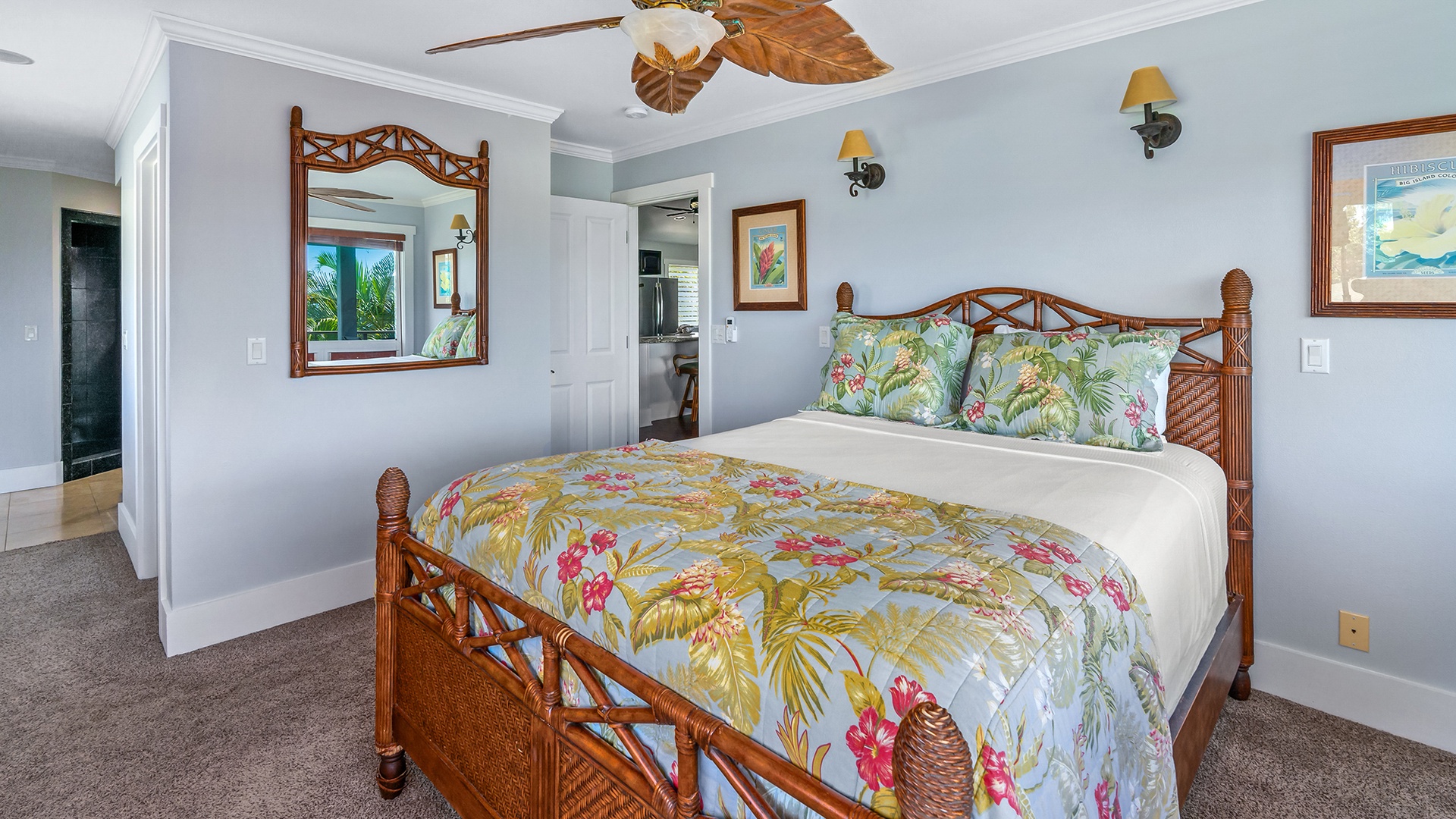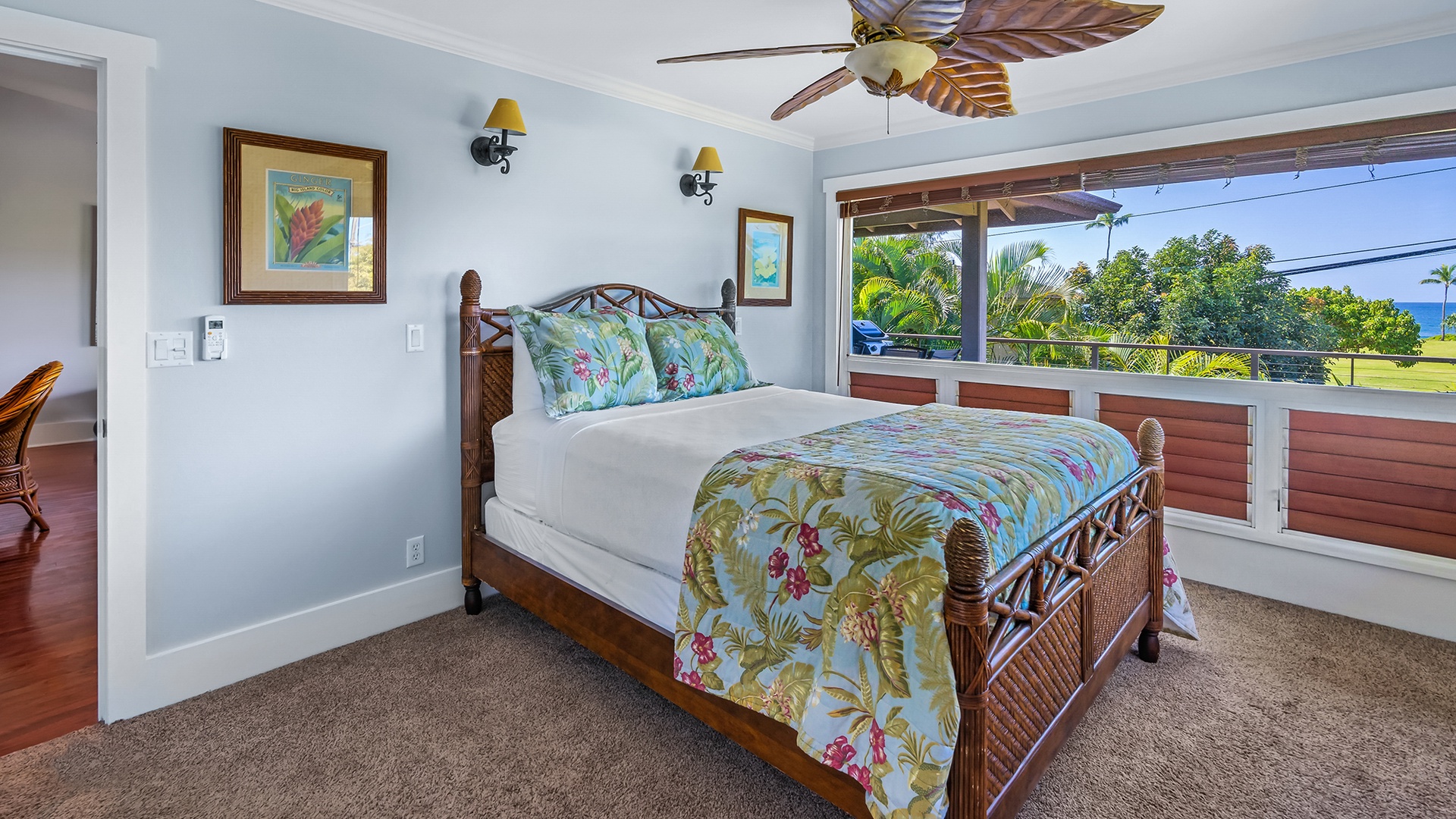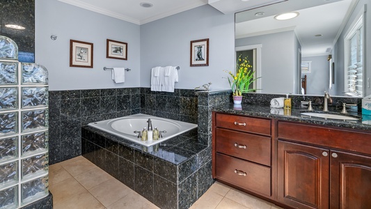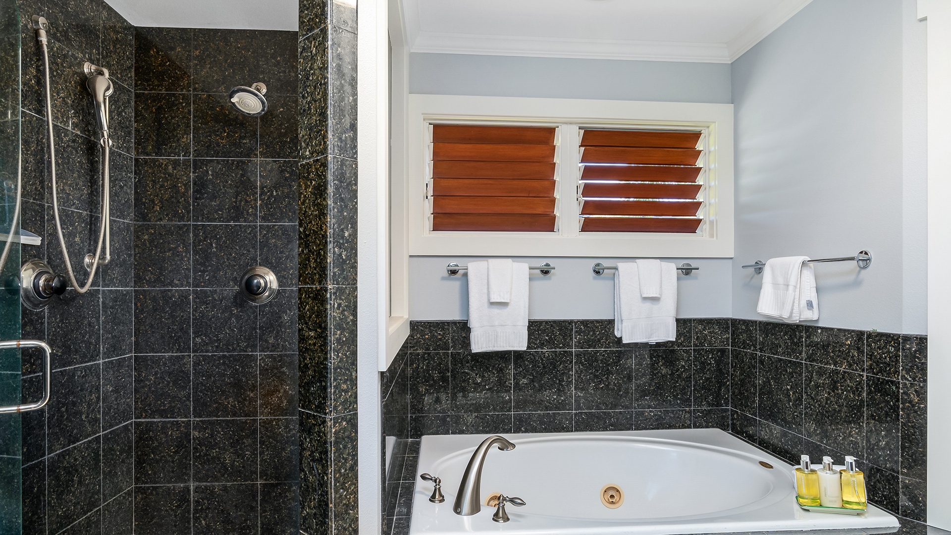 • Master Bedroom Suite – Upper level, AC, distant ocean views, queen bed, full bath with walk-in marble shower, separate jetted jacuzzi tub