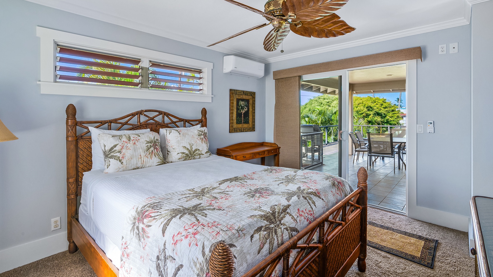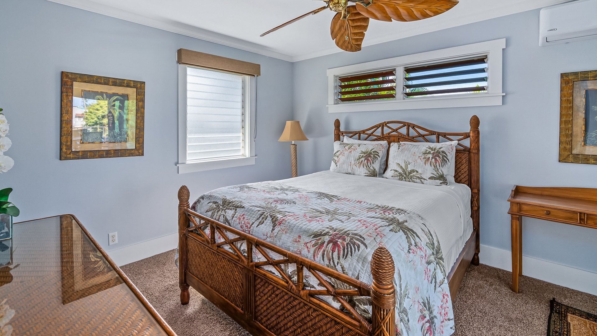 This was a great house to rent and I was pleasantly surprised at everything it had to offer. There was AC throughout that did a great job keeping the house cool. The house has been renovated inside so the interior was bright, nice and clean. The two master bedrooms upstairs have ocean views of Poipu Beach and nice dark rock/large showers. The downstairs we didn't use but had two beds and a separate bathroom. Perfect to walk across the street to hit Brennecke's Beach or the calm kid friendly beach that's sheltered by rocks. The house is behind another house so it appears like your view is blocked, but the view from the balcony looks right out past the other home onto the beach so all rooms upstairs have a nice view. Easy parking under the house. Keep in mind there are a lot of roosters around Poipu Beach Park because of all the people/snacks they get and they do start calling out fairly loud at 4-5am. I am on West Coast/PST time so that was okay with me, but I did hear them at odd hours some other nights at 1-2am. I guess the chickens on Kauai are nocturnal. If you really want to drown that noise out you would probably need a swim ear plug to muffle it. Otherwise great stay and this is a top choice of mine to book when I am back next year!