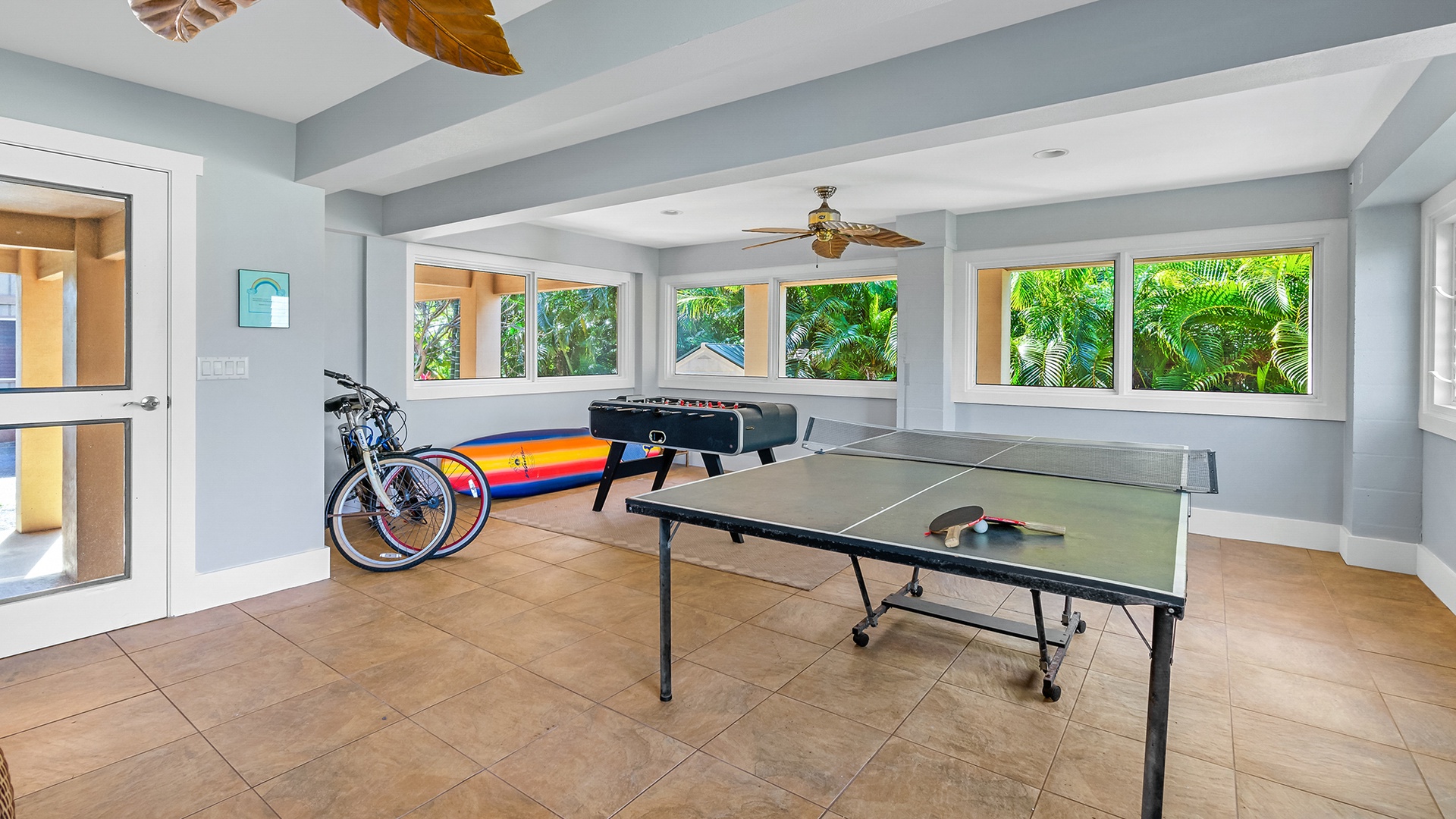 This home is very comfortable for big families or multiple couples. The bedrooms are very private with 2 bedrooms upstairs on opposite sides of the home. The third bedroom with a queen and double bed (very roomy) downstairs. Each bedroom has its own bathroom with shower. My grandkids loved the playroom with ping pong and foosball table. Brennecke\'s restaurant is practically next door and the beach is across the street. The owner, Kelly is quick to handle anything that might come up. We had a most enjoyable stay, really enjoying the lanai watching the ocean. It had everything we needed to have a great vacation.