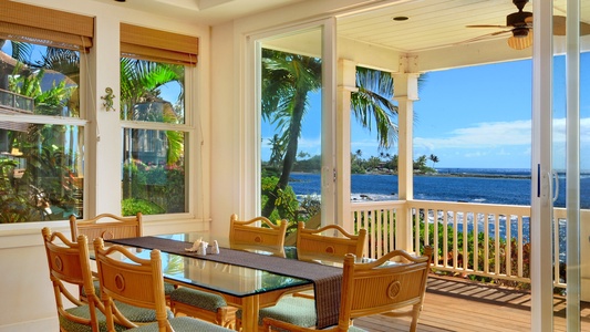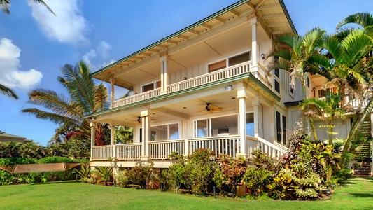 With its exceptional shoreline location, Hale Mahana Kai is among our spacious, Kauai oceanfront rentals so close to the water that the sound of the waves is heard in every room. Located near the end of the road, overlooking Kukui`ula Bay and beach as well as a short walk to Spouting Horn and the National Tropical Botanical Gardens, this home is located in one of the best all around spots on the South Shore of Kauai.