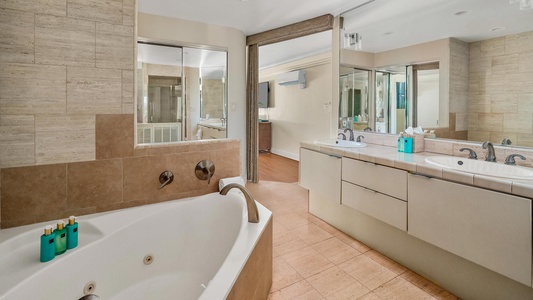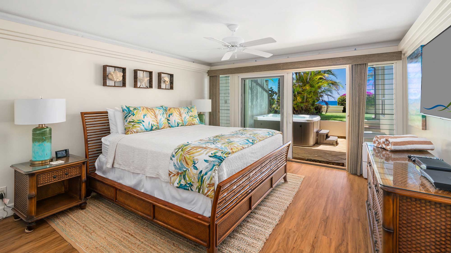 • Master Suite – lower level, ocean view lanai with Jacuzzi spa, king bed, TV/DVD, full bath with walk-in shower and whirlpool tub