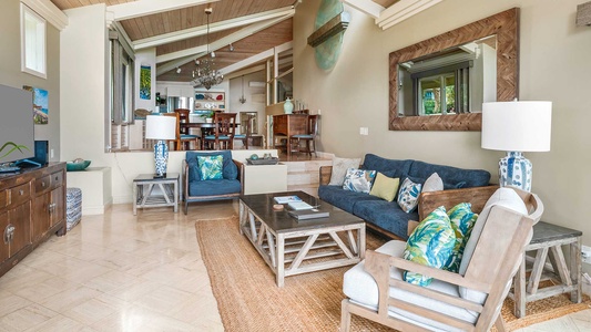 First of all, the Parrish Group is fabulous! Any questions or requests you have, they respond immediately. We rented Hale Nani through them as well as a one-bedroom condo at Poipu Kapili two doors down, and both were just excellent accommodations. I had a VERY bad experience with AirBnB, so this was a night-and-day difference. Bravo! As another reviewer noted, Hale Nani is not just two levels but multiple levels, which presented a bit of a challenge for one of us getting over a knee injury. But there are railings next to all the stairs, so one feels safe going up and down. (The only spot that did not have a rail was the two steps down to the living area, which made that a little more precarious for that person, so I'd request the installing of a rail on that wall). You should also be aware that the tile throughout the house is quite slippery. As they ask you to take off your shoes when you enter the house (in typical Hawaii fashion) we luckily had some flip-on bedroom slippers with rubber soles that we wore in the house. With those, we were fine. Would highly recommend bringing something like that to ensure your safety. The house is probably the best stocked/prepped of any place we've ever stayed-- I usually have to go and buy things, but all I bought was a big bouquet of tropical flowers! Super clean. Loved the amenities. The new furniture in the living room is beautiful as well. All the rooms have ceiling fans and a/cs, but we only used the ceiling fans and left everything open. But we were only in the house when we needed to be and spent 99% of our time on the lanai anyway, just watching the water, walkers. and cars. And though there are cars that come to the seawall to park and watch the sunset, in 5 nights not one of them was noisy and none stayed long. There was only one night when one car stuck around longer, but they weren't too loud nor was their music. Maybe we lucked out? A wonderful property and will definitely return!