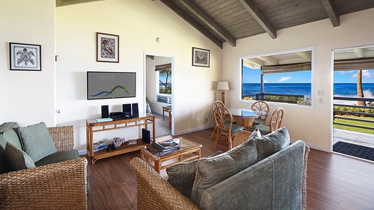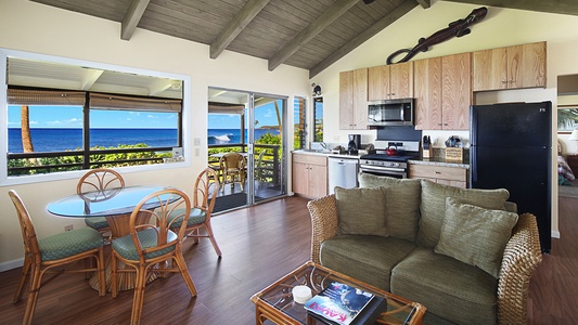 • Great room design – oceanfront living room, dining room and small kitchen with gas stove and oven
