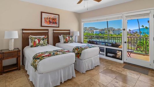 • Second Bedroom Suite – ocean view, AC, king bed (two twins upon request), access to private ocean view lounging lanai, full bath, tub with shower
