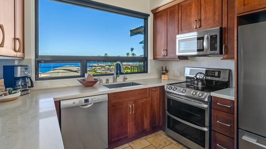 We stayed in this beautiful unit with the perfect ocean view from almost every window and lanai. The kitchen was obviously newly remodeled and very well equipped, had gorgeous bathrooms and great comfortable beds. The short walk to two different beautiful beaches (one beautiful and not crowded, another an awesome snorkeling beach) and cliff trails made the location just perfect. And there were plenty of places to walk or take a short drive to for drinks and food if one didn't feel like eating in. Would highly recommend this unit to anyone looking for a slice of paradise and can't wait to go back.