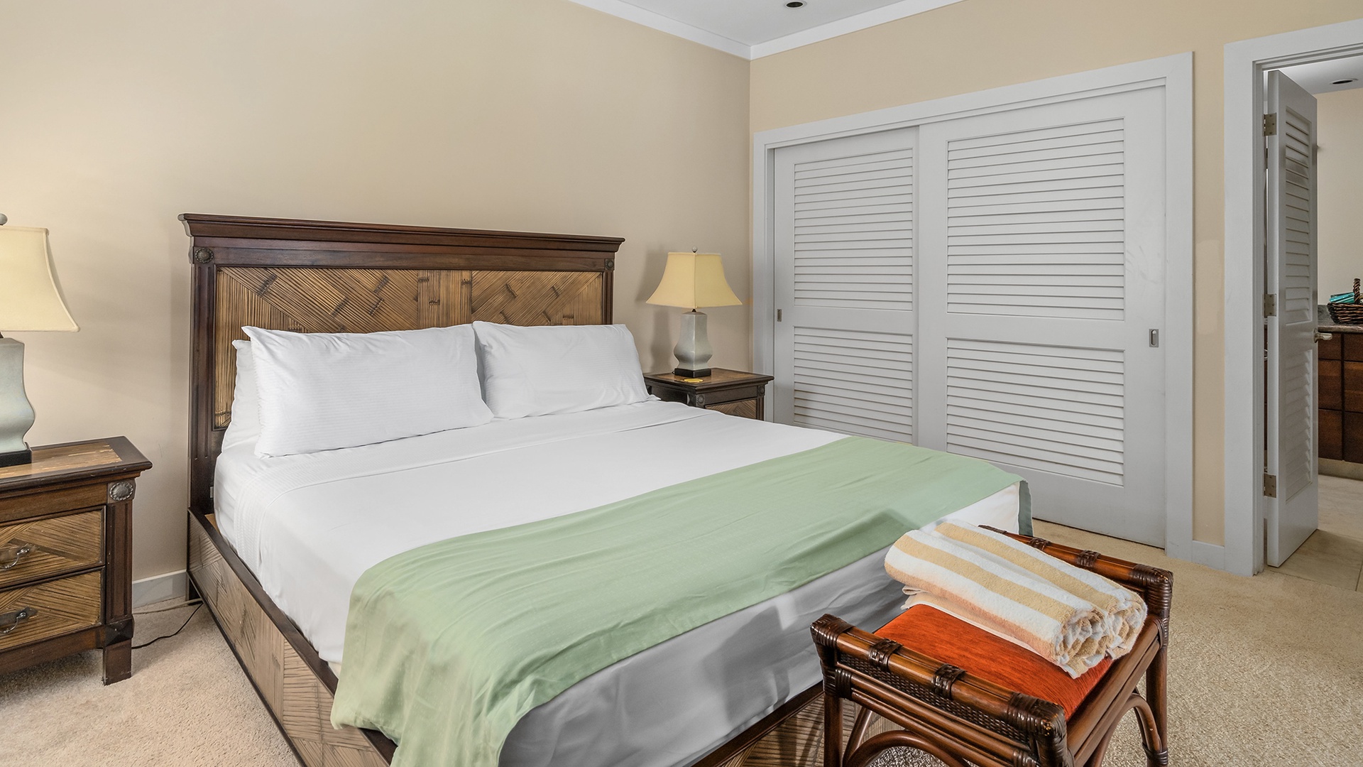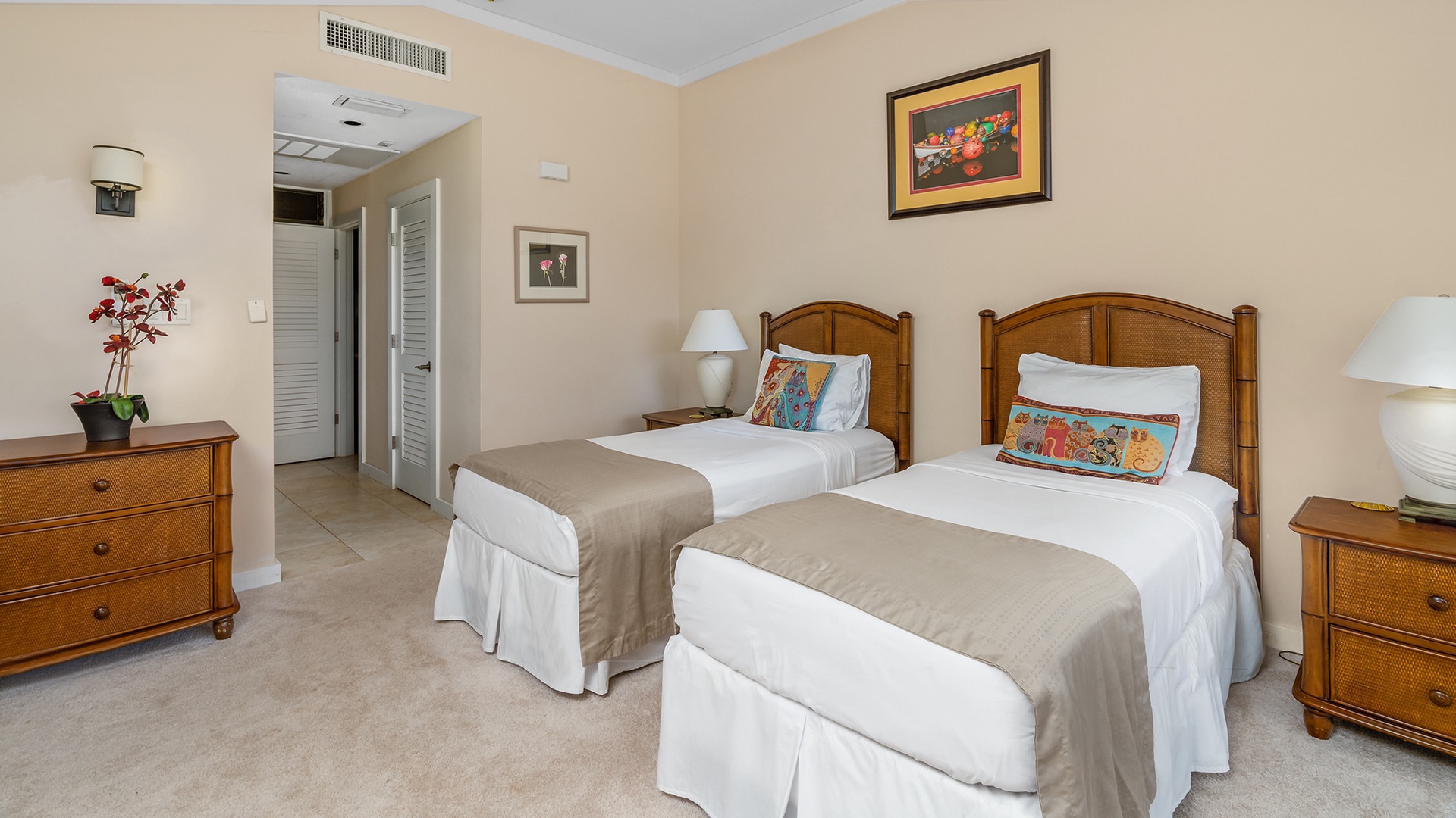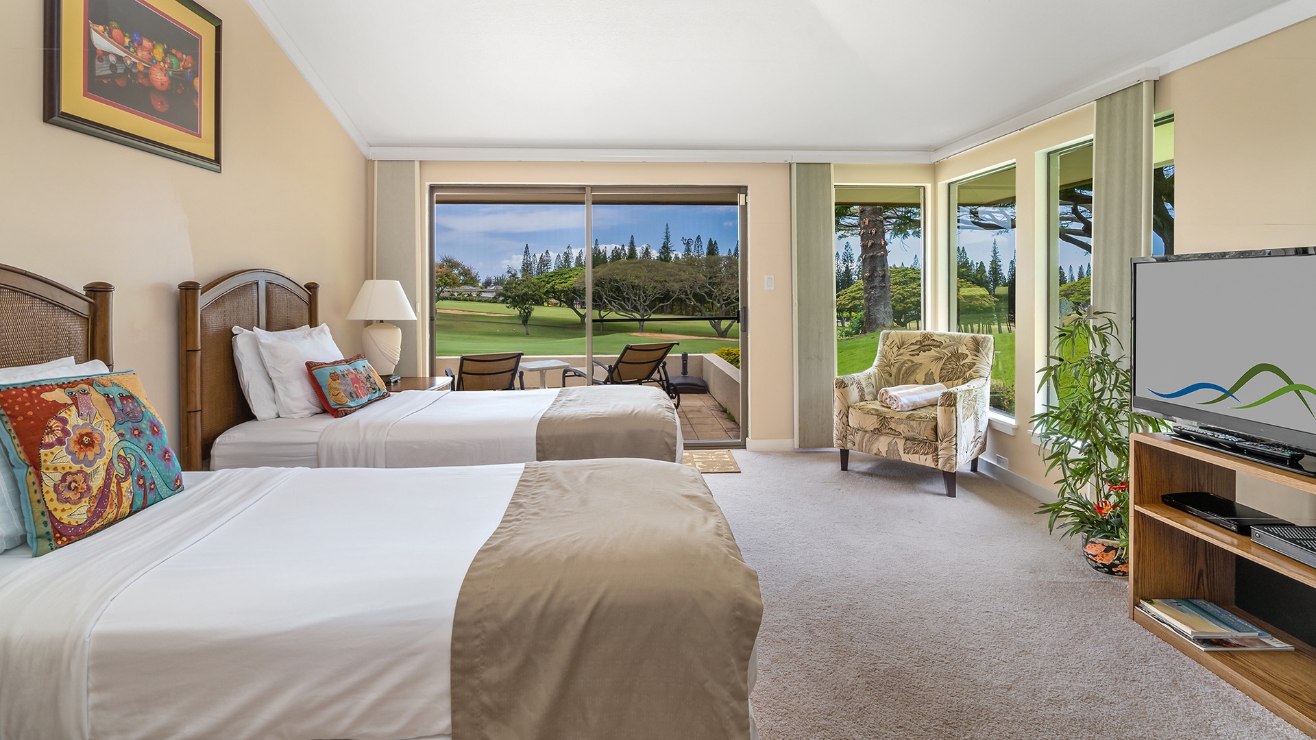 • Second Bedroom Suite – golf course view, AC, two twins (convertible to one king upon request), TV, access to golf course view lounging lanai, full bath, tub with shower