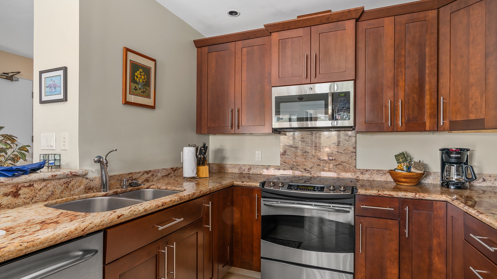 • Fully equipped kitchen with stainless steel appliances, breakfast bar