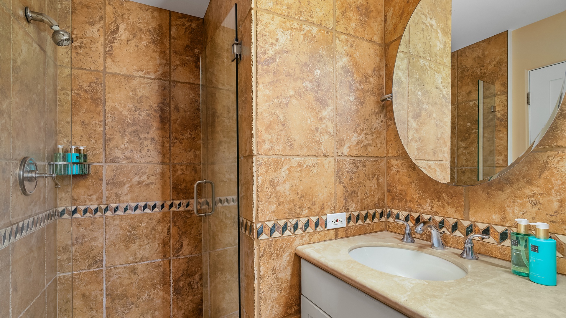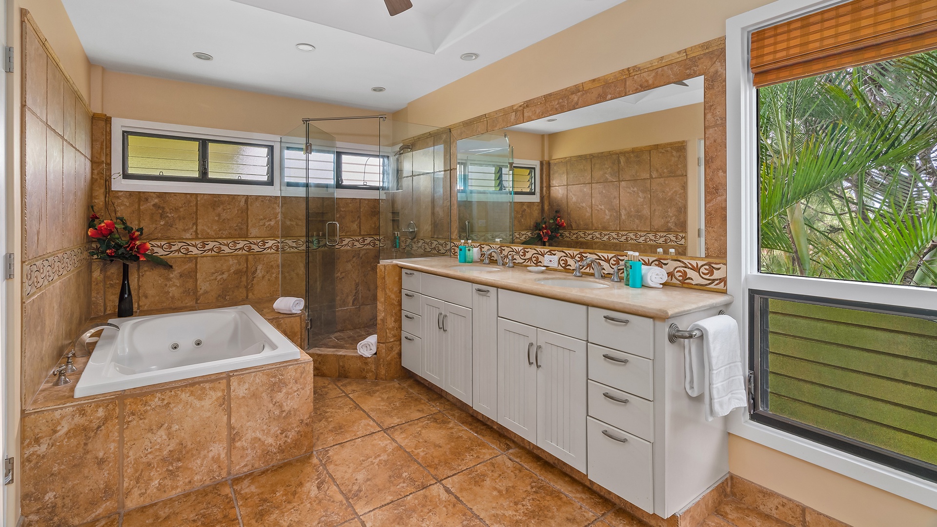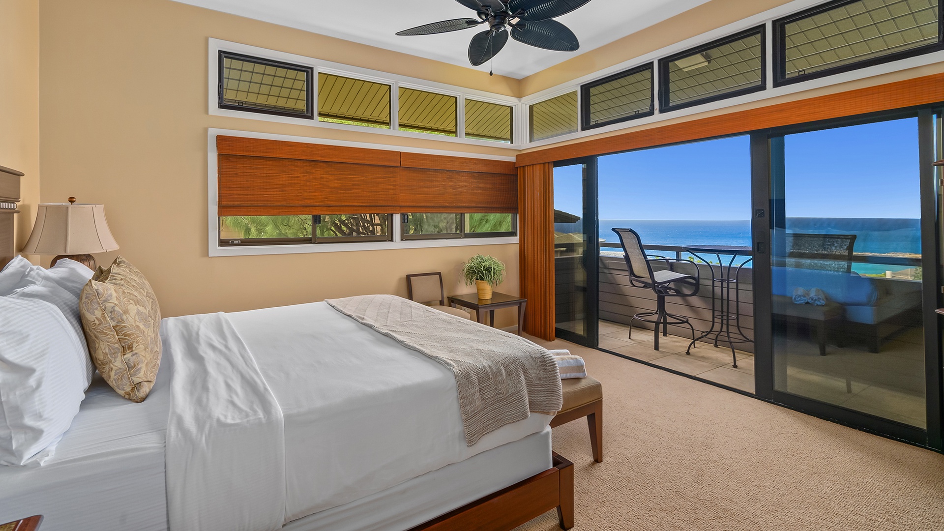 • Master Bedroom Suite – ocean view, AC, upper level, king bed, flat screen TV, access to private ocean view seating lanai, full bath with tub and walk-in shower