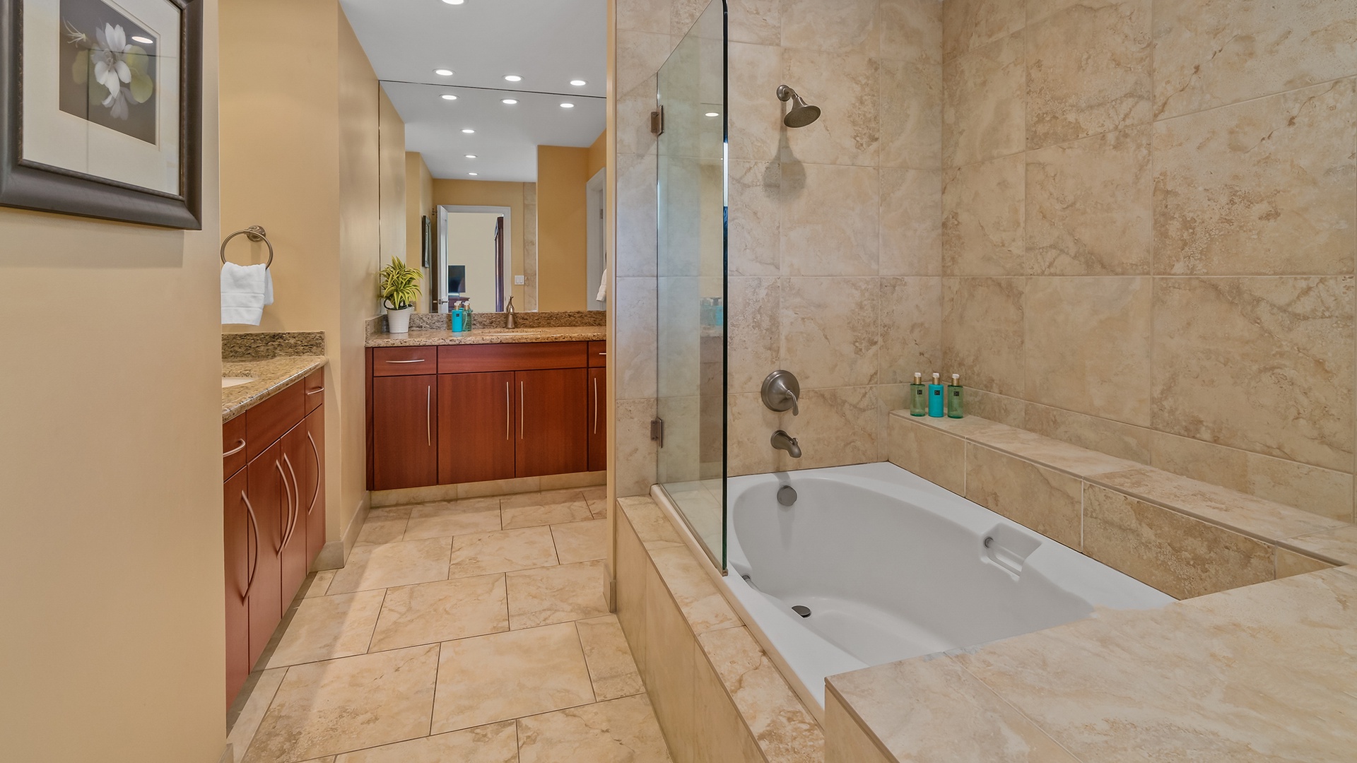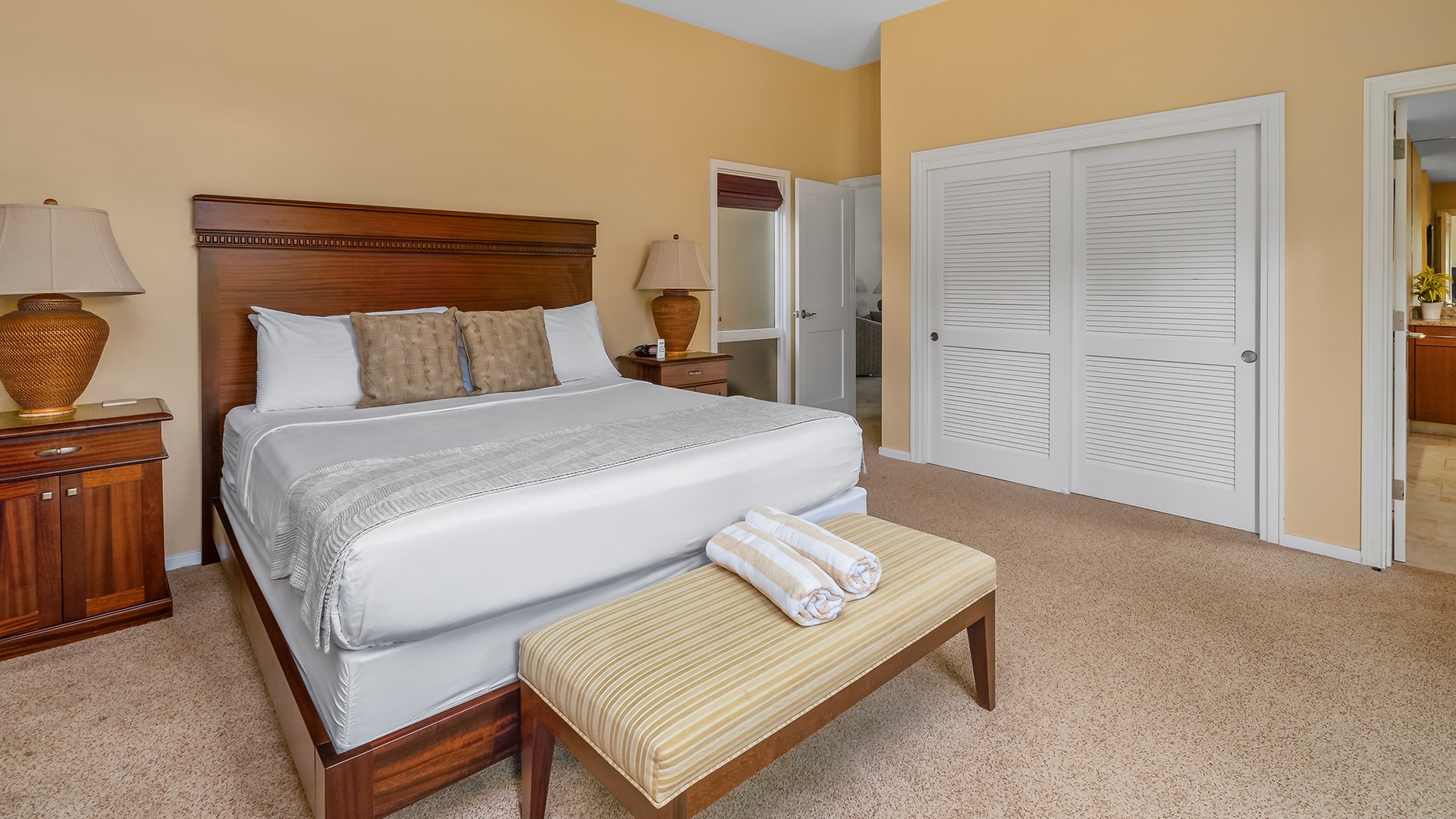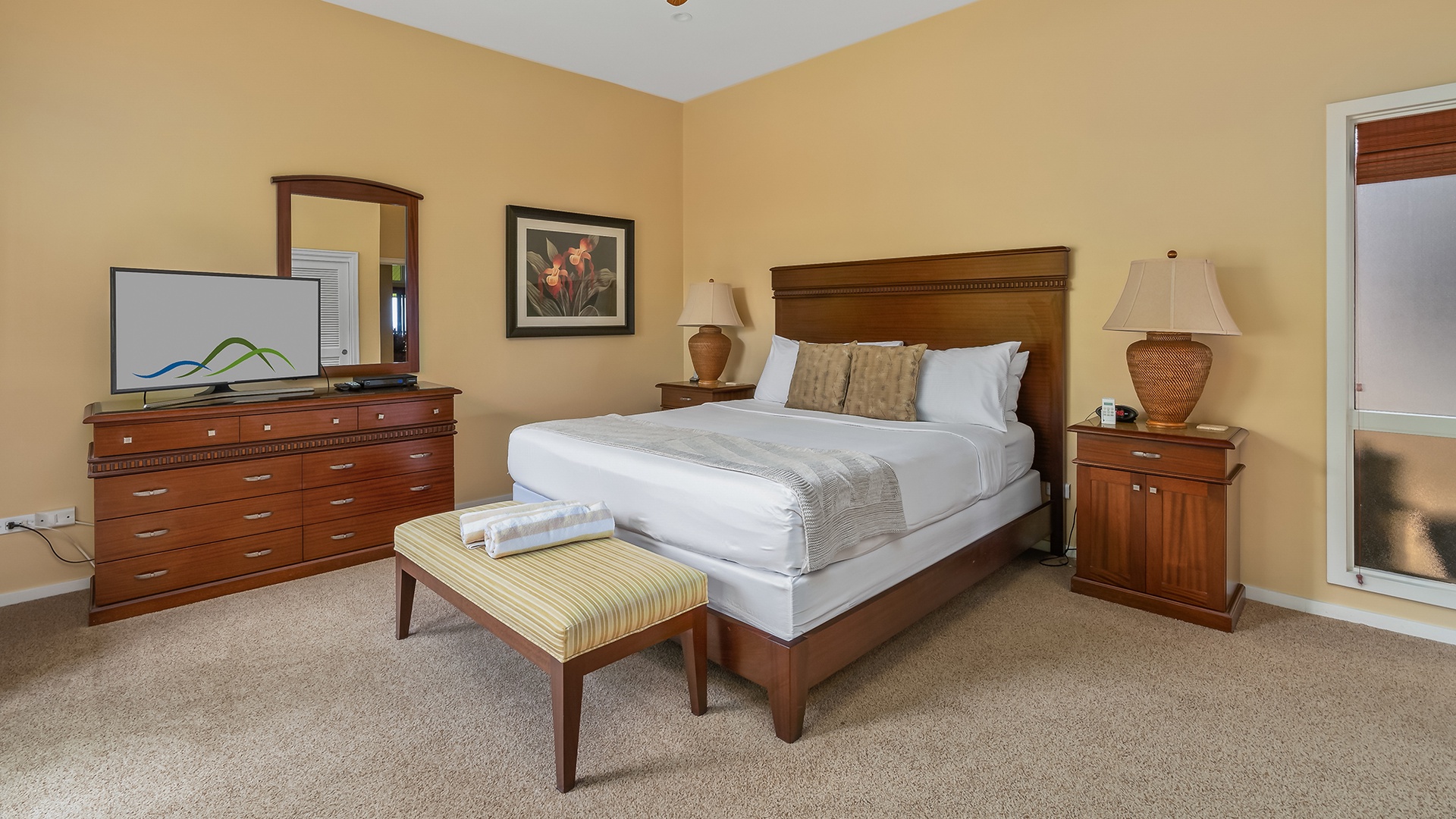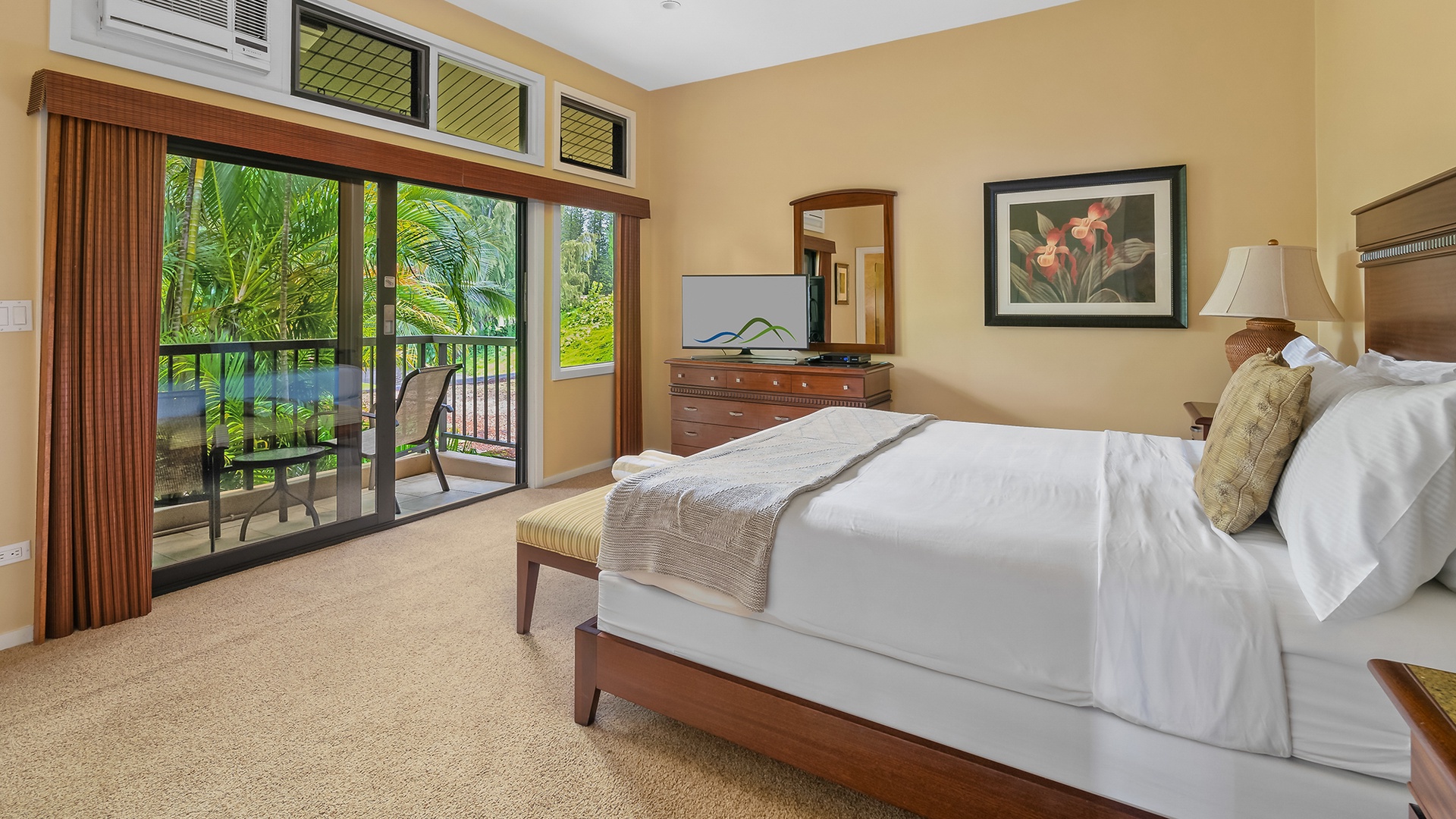 • Master Bedroom Suite – garden view, AC, king bed, flat screen TV, access to private lanai, full bath, tub with shower