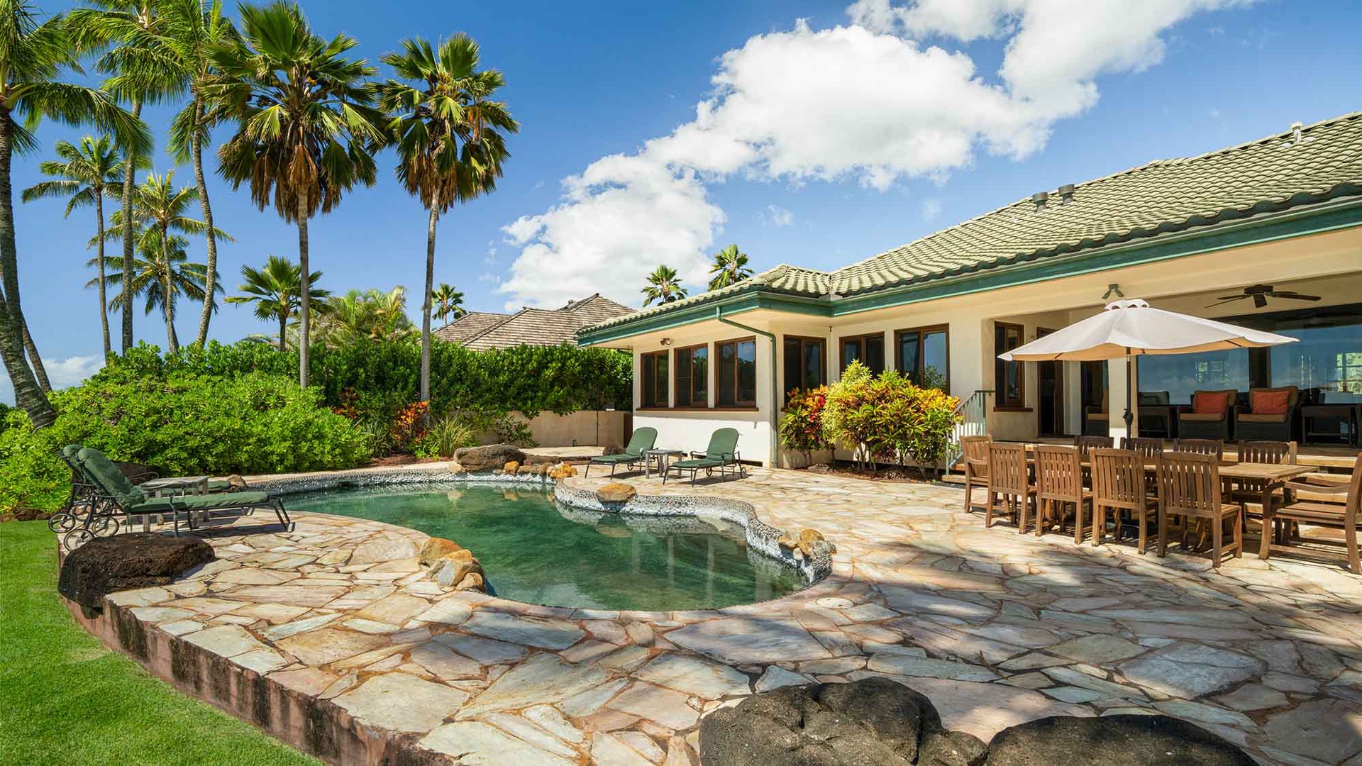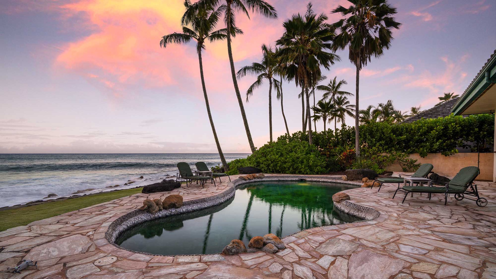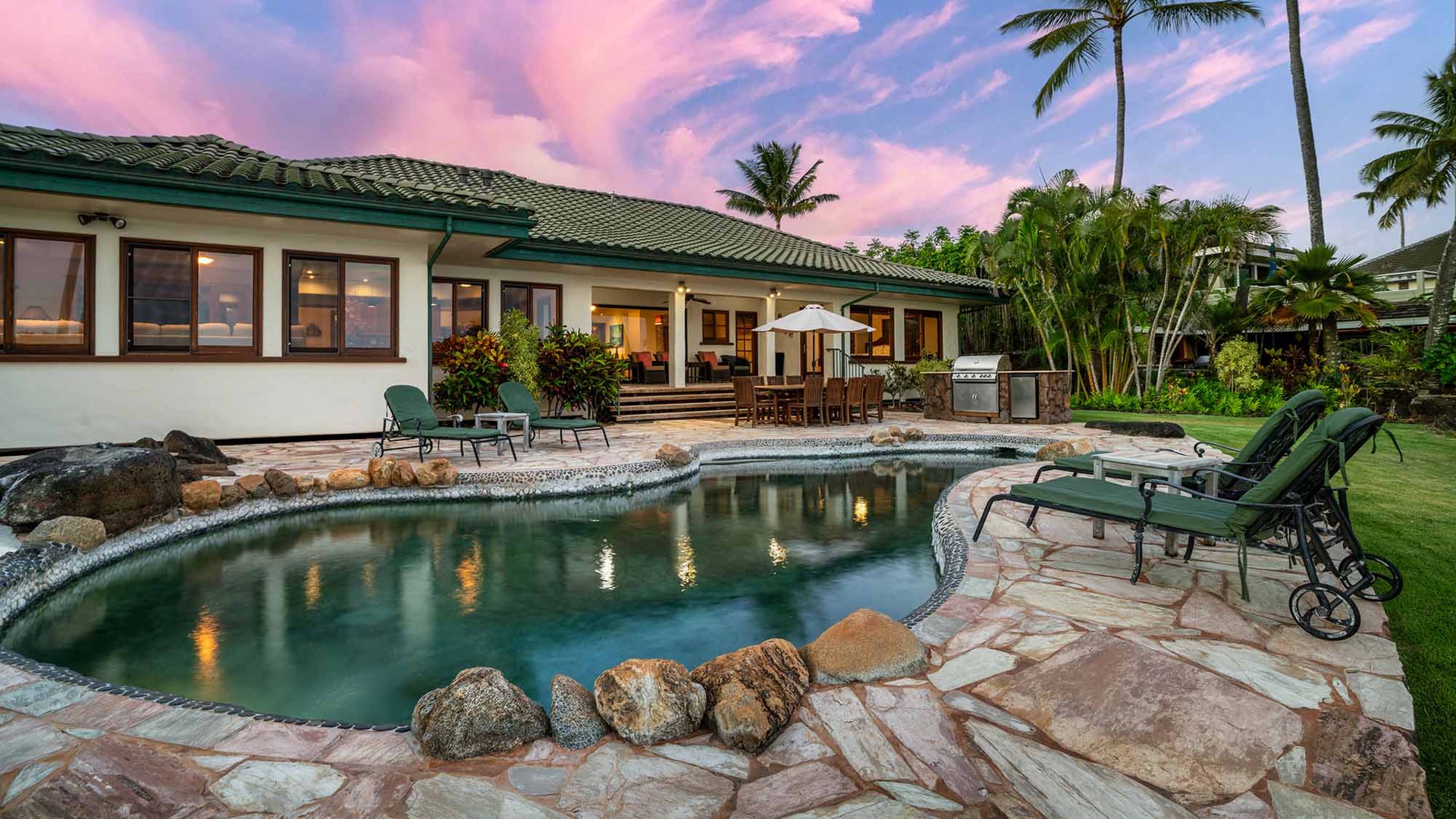 We stayed in this luxurious home over the Christmas holiday. The home was beautiful, very well maintained. The kitchen was lovely and had everything we could possibly need. The oceanfront pool was our favorite. The little touches, i.e., the Mai Tais, the welcome basket full of goodies, the well stocked essentials such as extra towels, pool towels and toys, was appreciated. There was a power outage while we were there and it caused the pool pump to quit working. We called Parish Kauai's office and within a couple of hours we had two maintenance personnel at our door to fix it. Just excellent service! We will definitely stay with Parish Kauai again in the future.