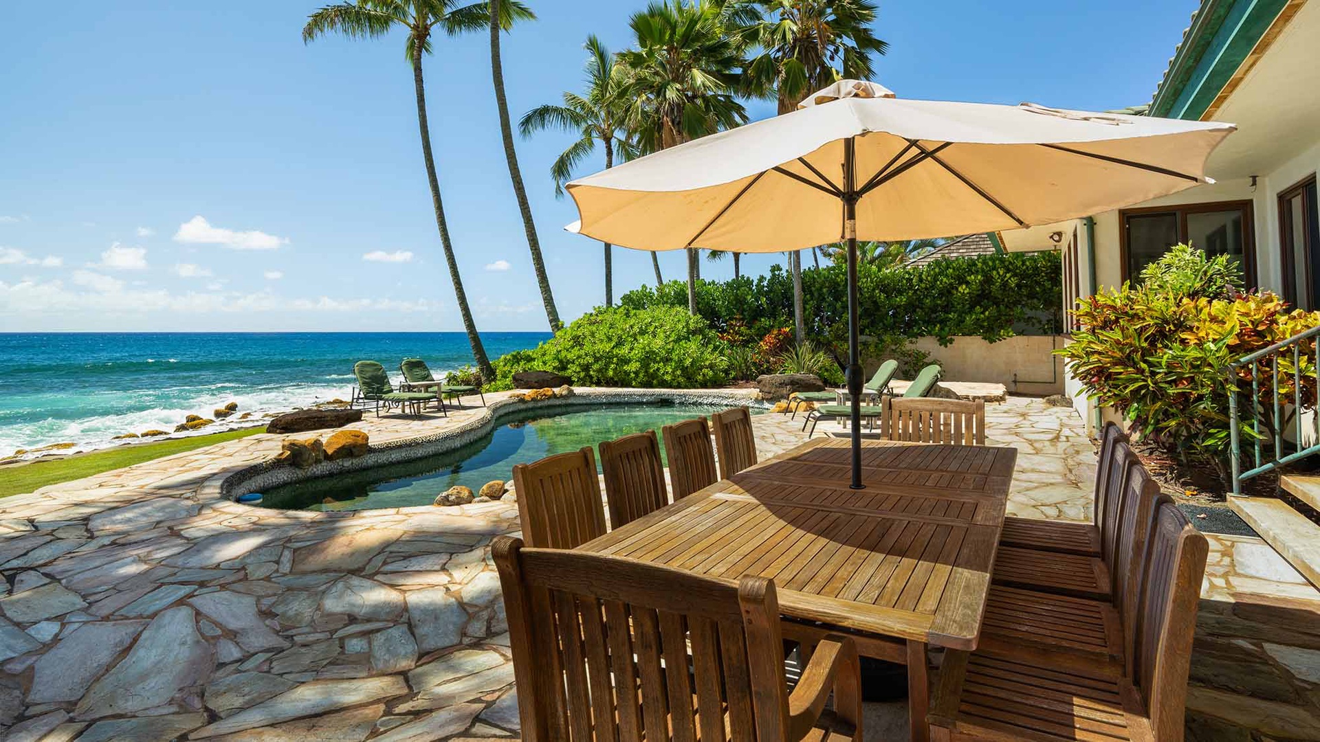 One of the island’s finest Kauai oceanfront rentals set on the dramatic Poipu Beach coastline. Remodeled to perfection, this home has ocean and coastline views from almost every room and offers the perfect setting for the vacation of a lifetime. Showcasing stone floors, granite and limestone countertops, top-of-the-line kitchen amenities, designer furnishings as well as air conditioning, a swimming pool, and much more, one never has to leave this extraordinary property.