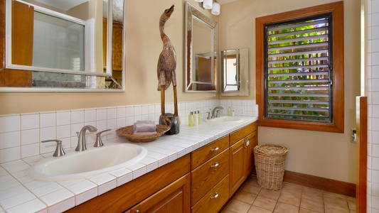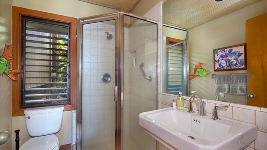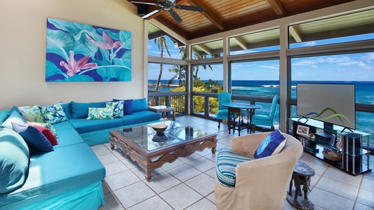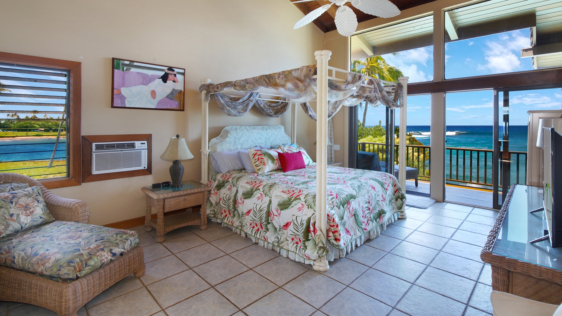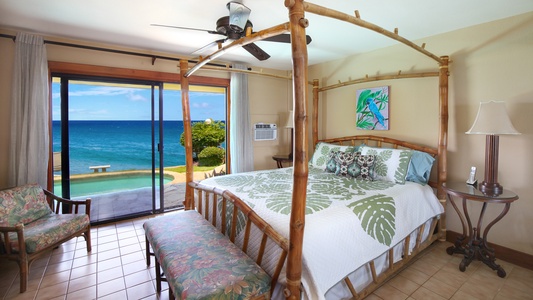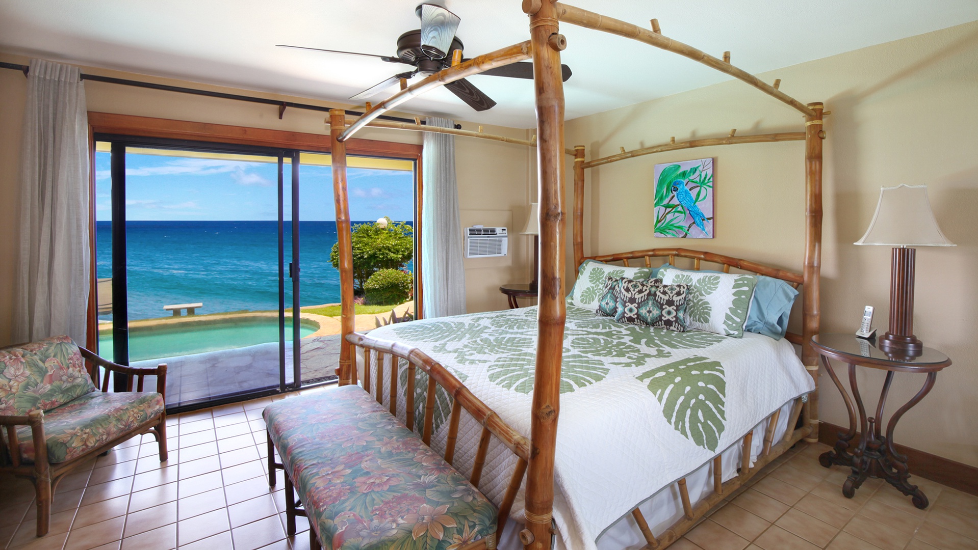 • Primary Bedroom Suite – upper level, king bed, AC, TV, access to oceanfront lanai, full bath with walk-in shower