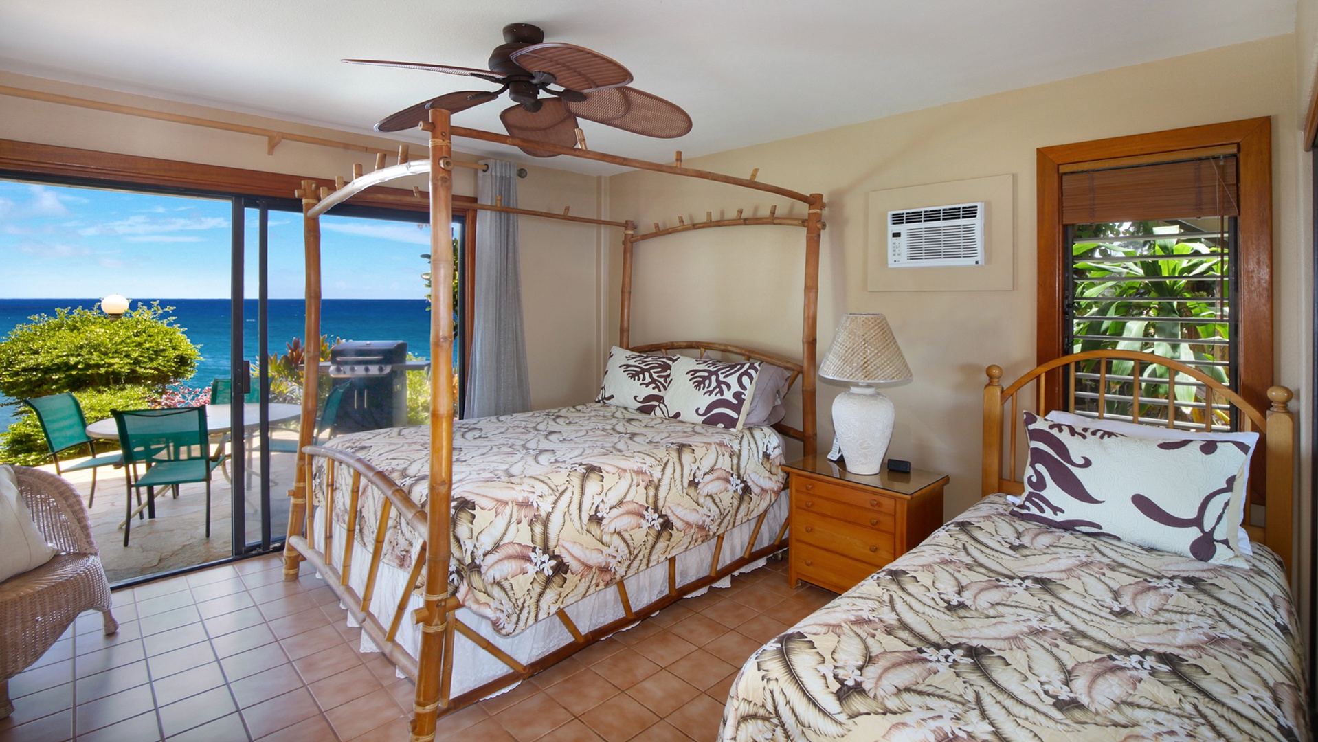 • Third Bedroom – lower level, queen and twin bed, AC, TV, access to oceanfront lanai & pool, shared full bath with shower
