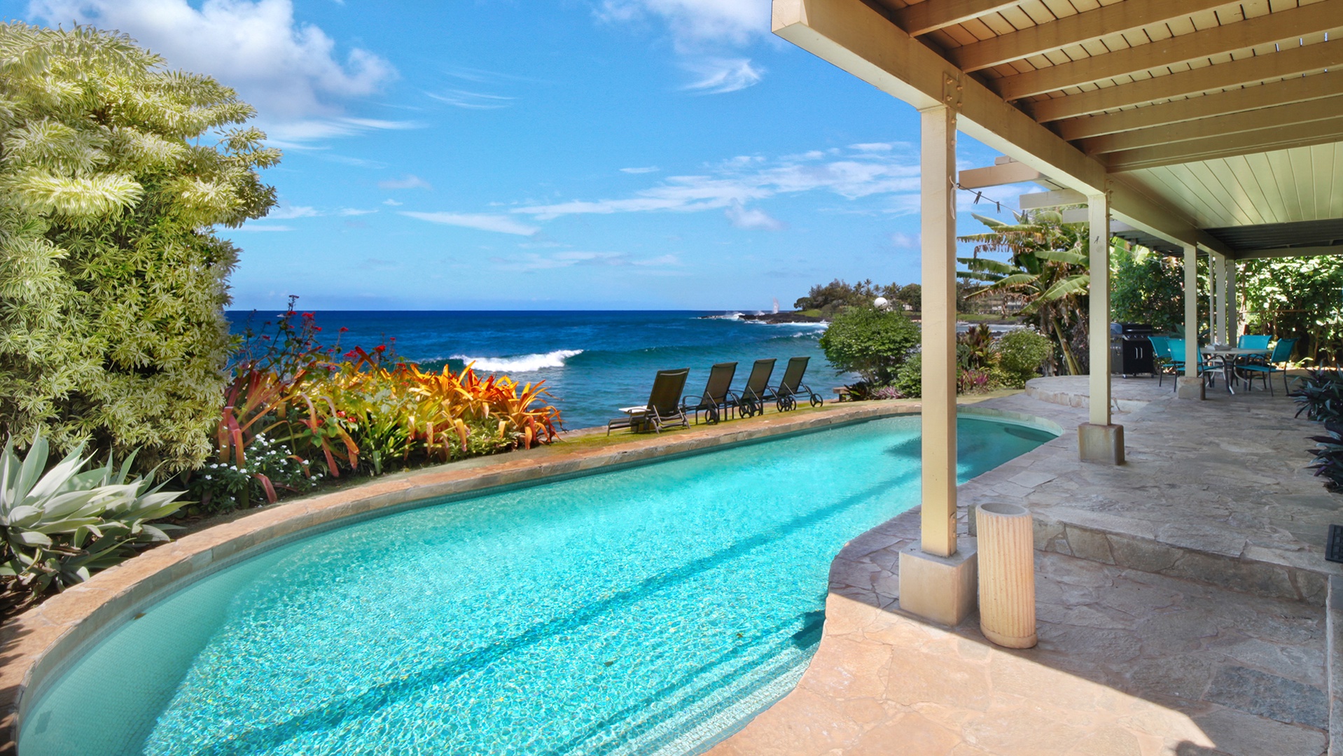 In one of the most sought-after locations on Kauai’s sunny south shore, Kukuiula Bay House is located close to the end of Lawai Road near Kukuiula Bay and the esteemed National Tropical Botanical Gardens. This three bedroom three and a half bath legal vacation rental residence is approximately 3,200 square feet and showcases boundless views of the Pacific coastline, nearby beach, backyard pool and Spouting Horn.