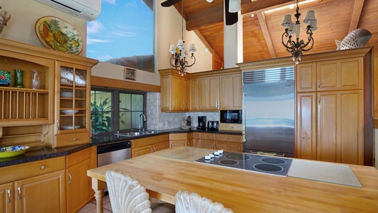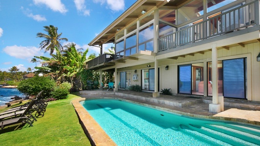 The main level includes a great room complete with living and dining area and fully equipped kitchen as well as access to the main primary air conditioned bedroom suite and accompanying lanais. The lower split level contains two air conditioned bedroom suites (one with a king bed and the other with one queen and a twin) as well as a fourth family pool room with a queen Murphy bed. In the oceanfront backyard you will enjoy the refreshing swimming pool, sunsets and seasonal whale watching.
