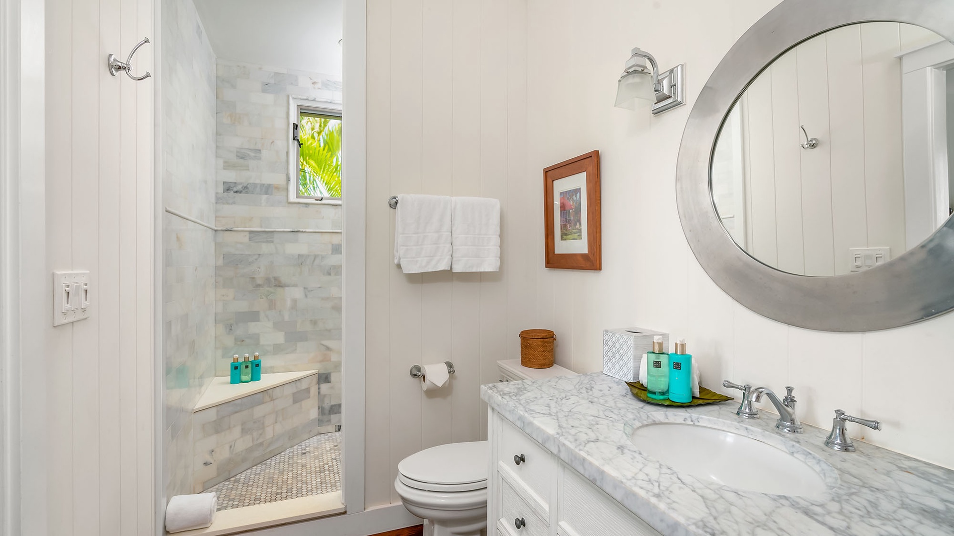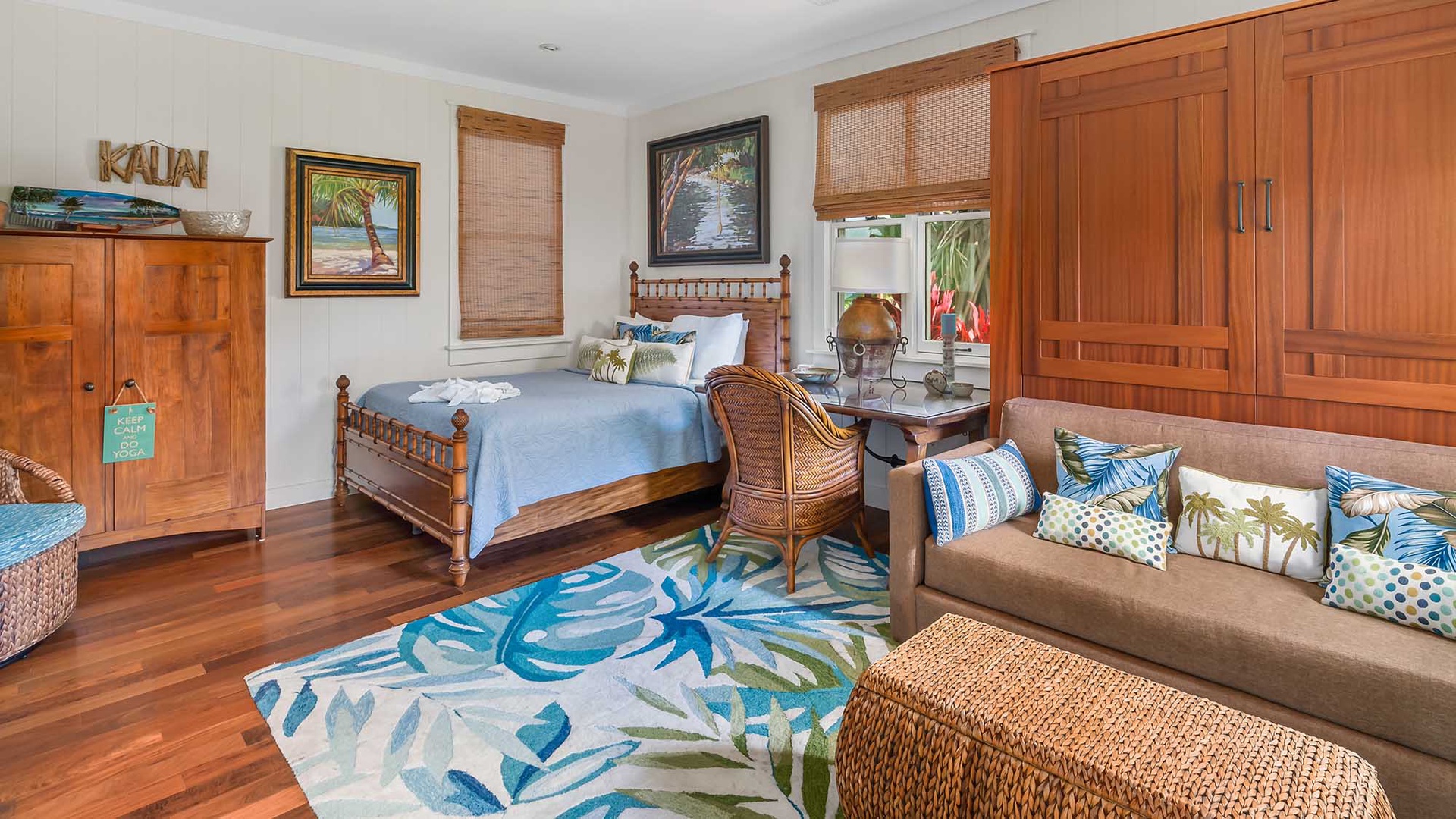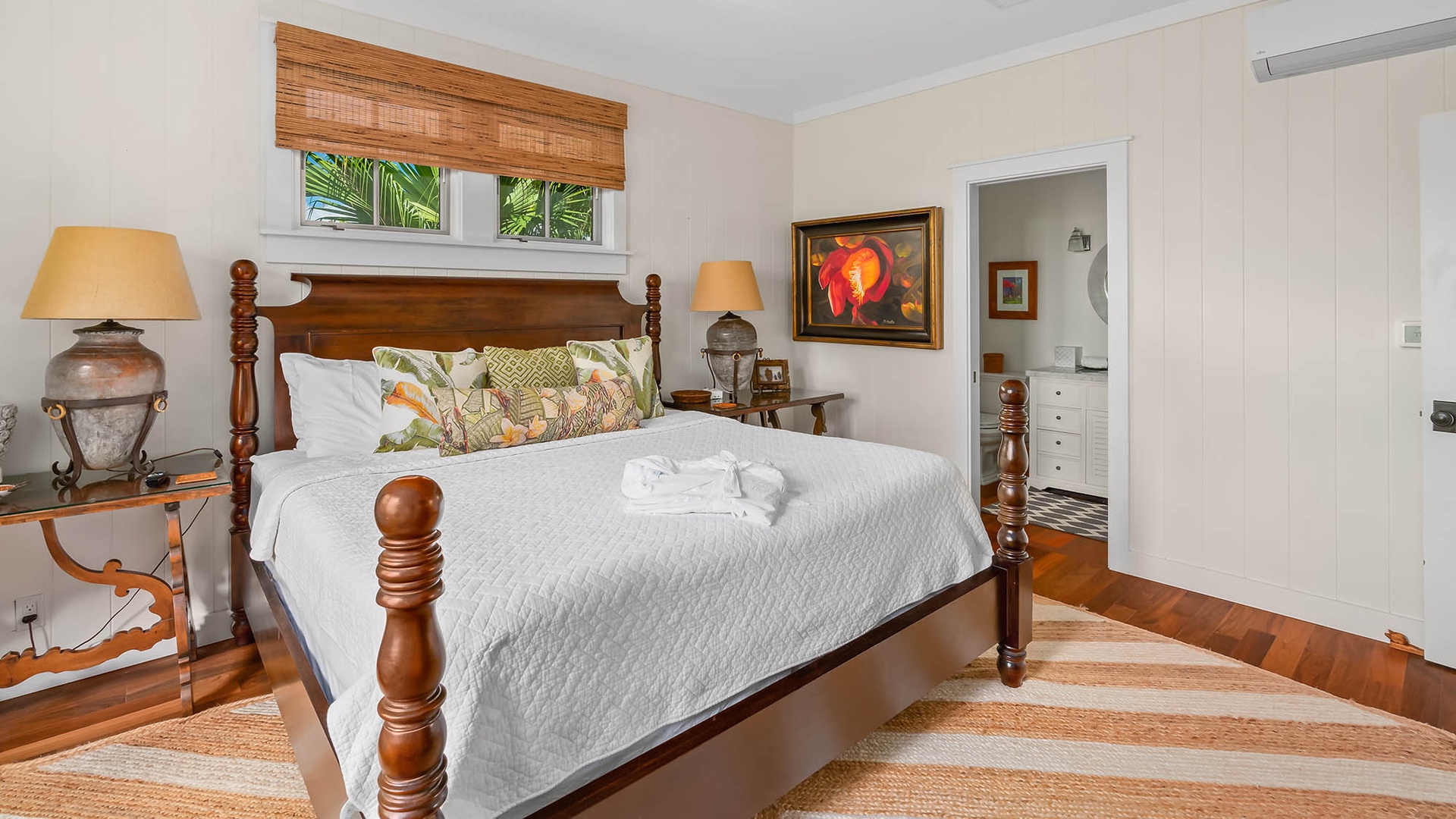 • Master Suite – Upper level, ocean view, AC, king bed, flat screen TV, full bath with walk-in shower, separate tub, private lanai