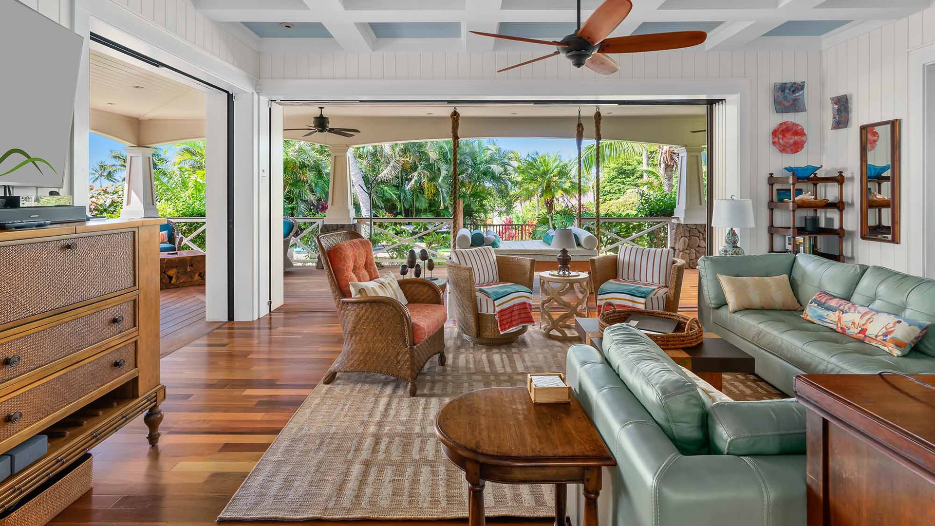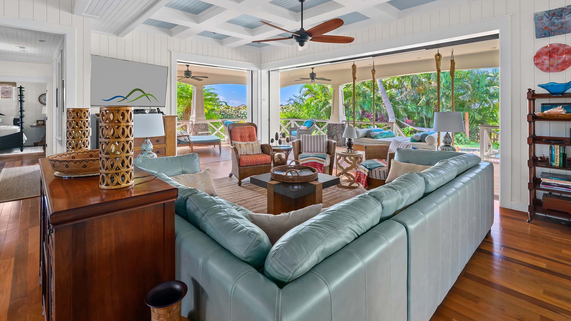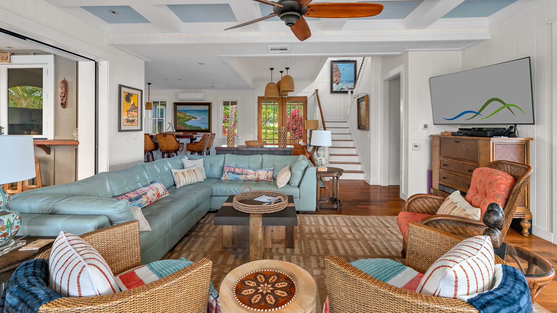 • Living room with large flat screen TV and DVD, separate conversation area, access to ocean view lanai and additional half bath