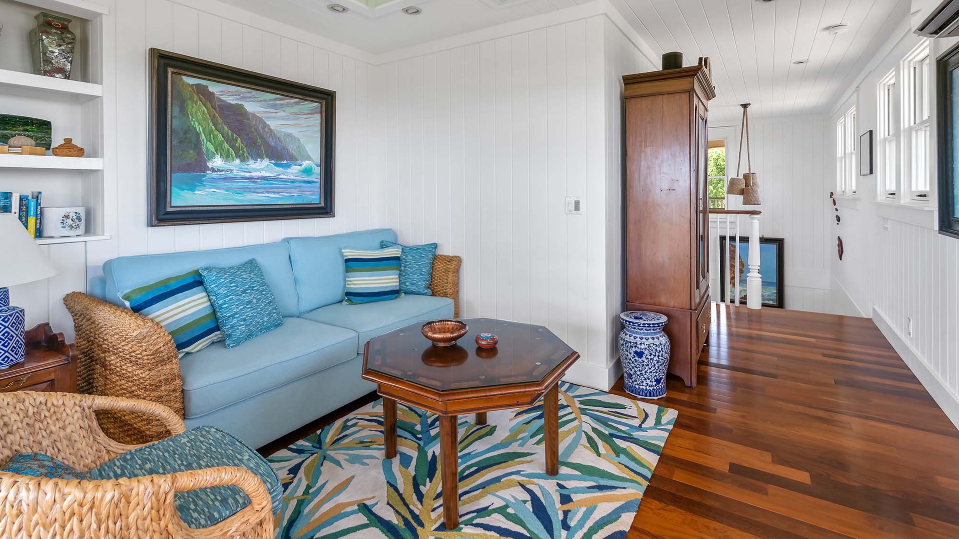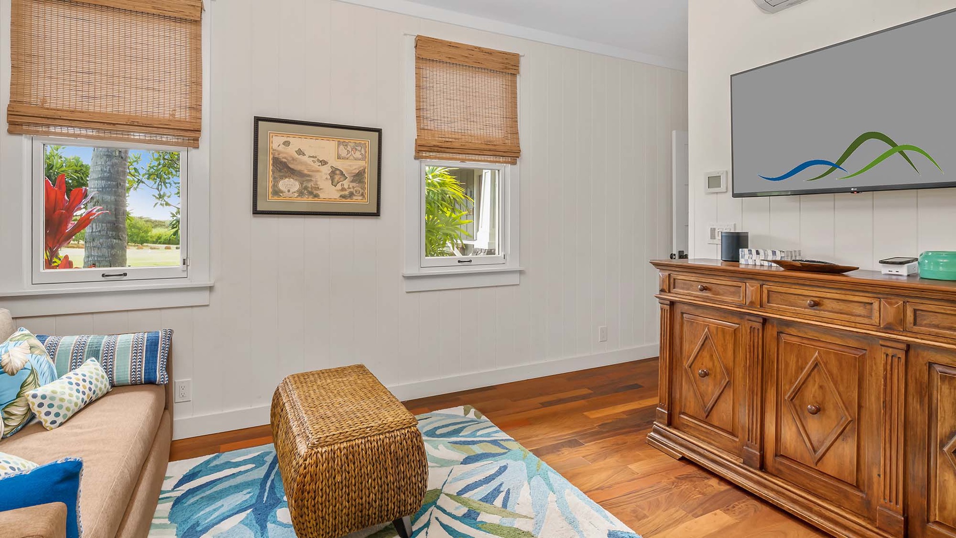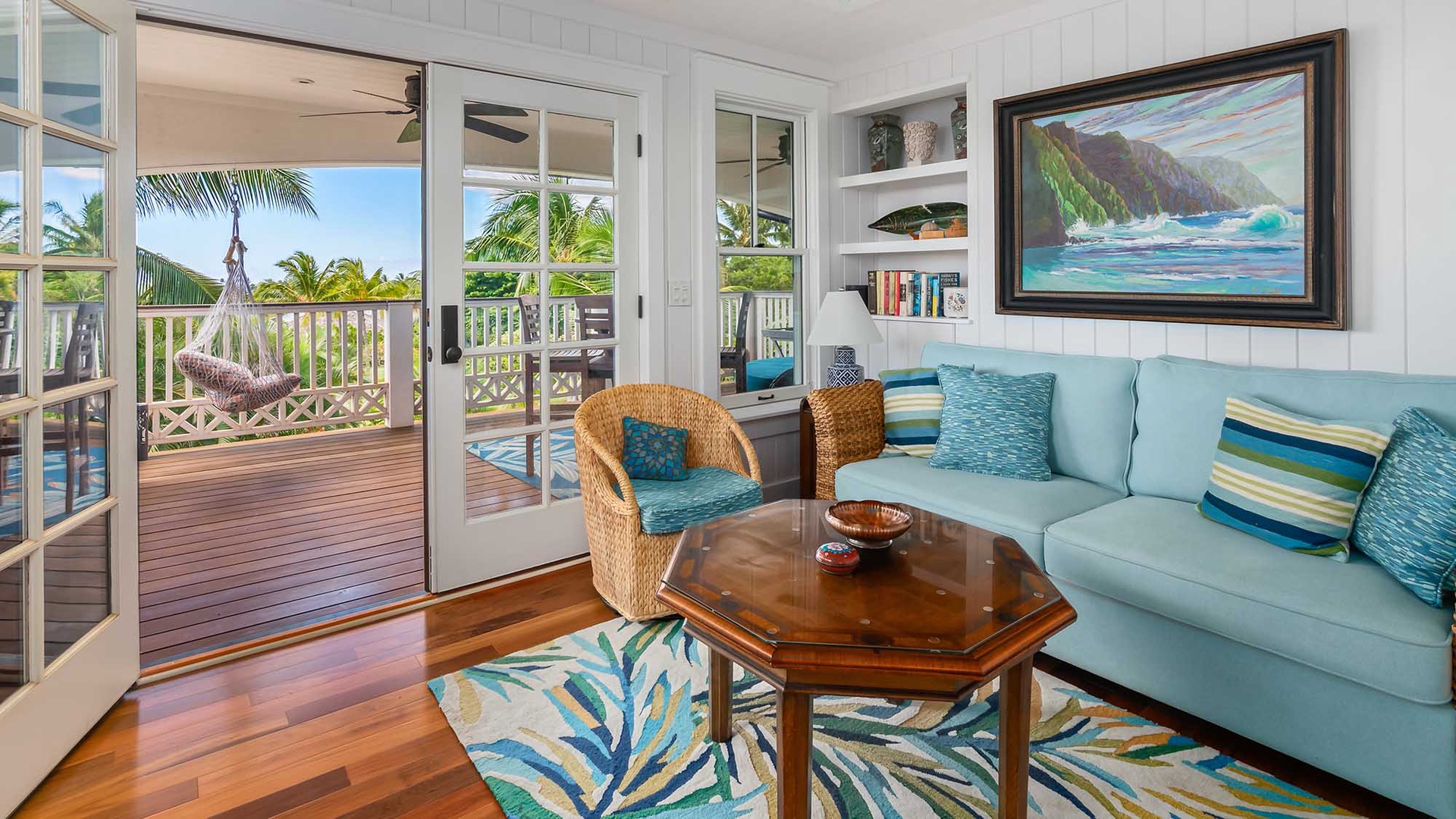 • Living room with large flat screen TV and DVD, separate conversation area, access to ocean view lanai and additional half bath