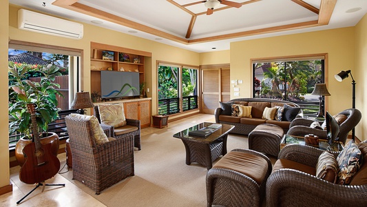 Tucked into the Lanai Villas section of the tropical Poipu Kai Resort, Maikalani is a Kauai vacation rental home exquisitely decorated and outfitted with all the necessities of home, including zoned air conditioning. Located on the lush green belt with easy access to Shipwrecks and Poipu Beach Park… beachcombing, swimming, sunsets, and other tropical vacation delights are all at your back door. A perfect setting for a romantic getaway, honeymoon or a small family gathering, this home is Poipu Resort living at its best.