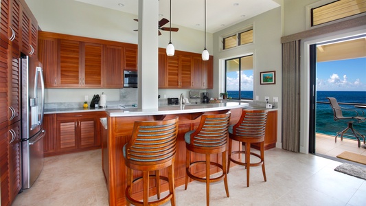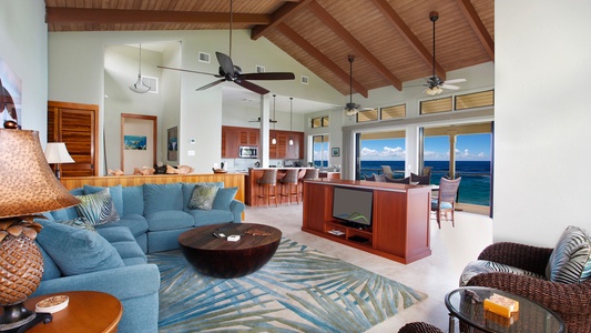 • Great room design – open living room, dining room and kitchen with oceanfront lanai access, TV in kitchen, 2 steps down to great room