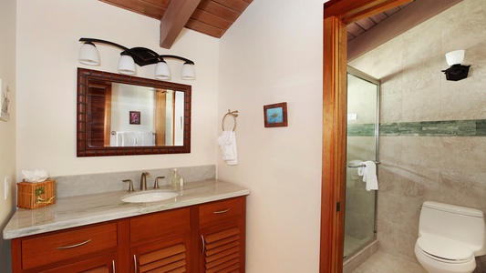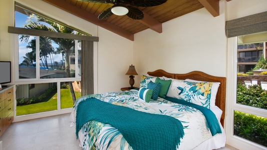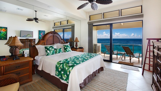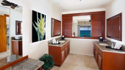 • Master Suite – king bed, ocean view, access to oceanfront lanai, TV, full bath with walk-in shower, double vanities, walk-in closet