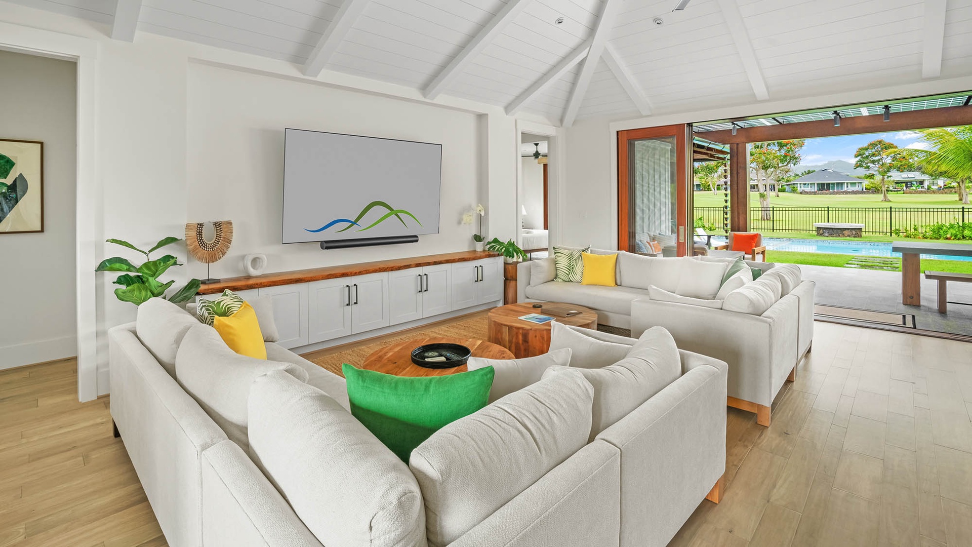 • Great room with vaulted ceilings, flat screen TV and access to outdoor covered lanai, with wood floors throughout