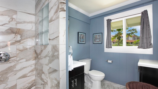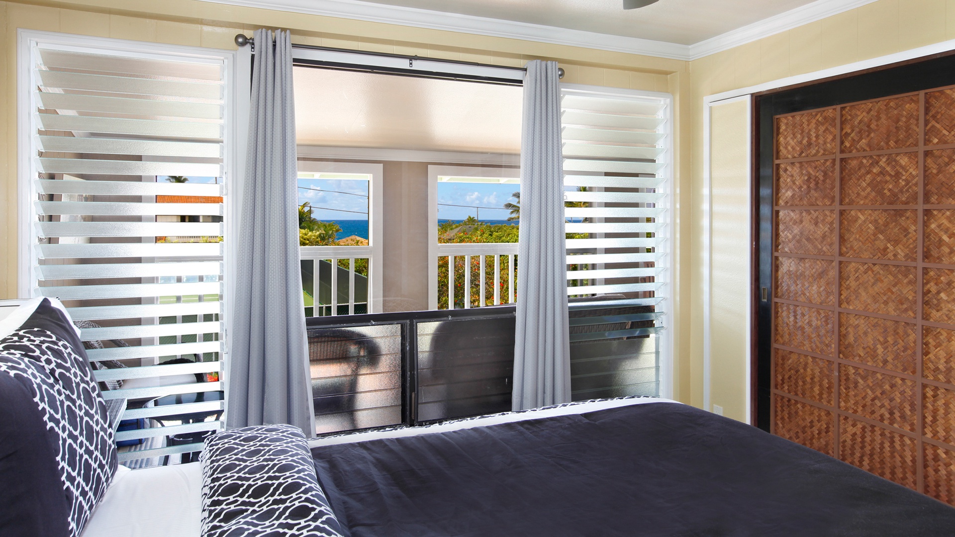 • Master Suite – Queen bed, ocean view, full bath with walk-in shower, ceiling fan, ocean view