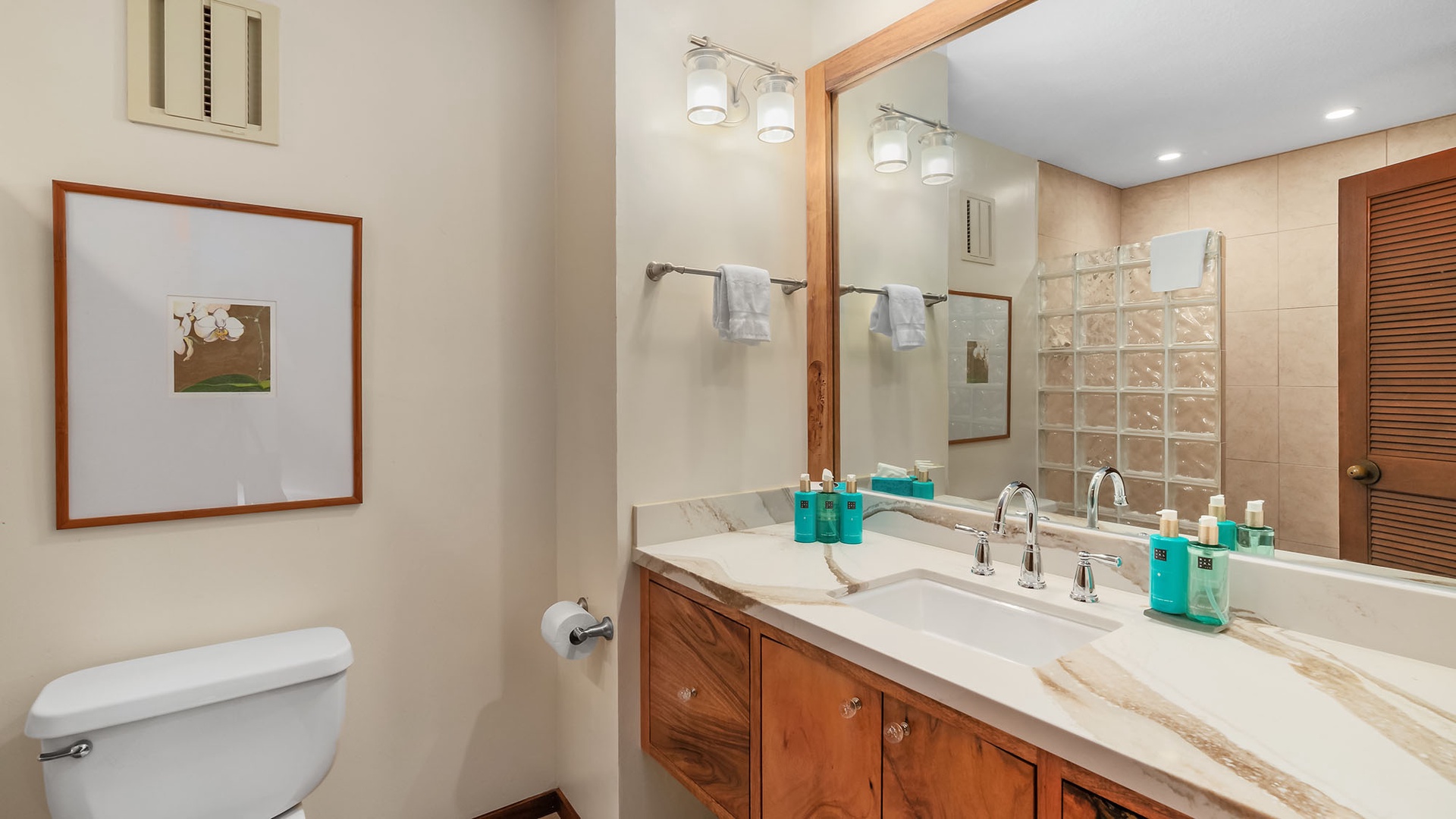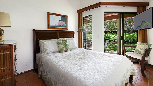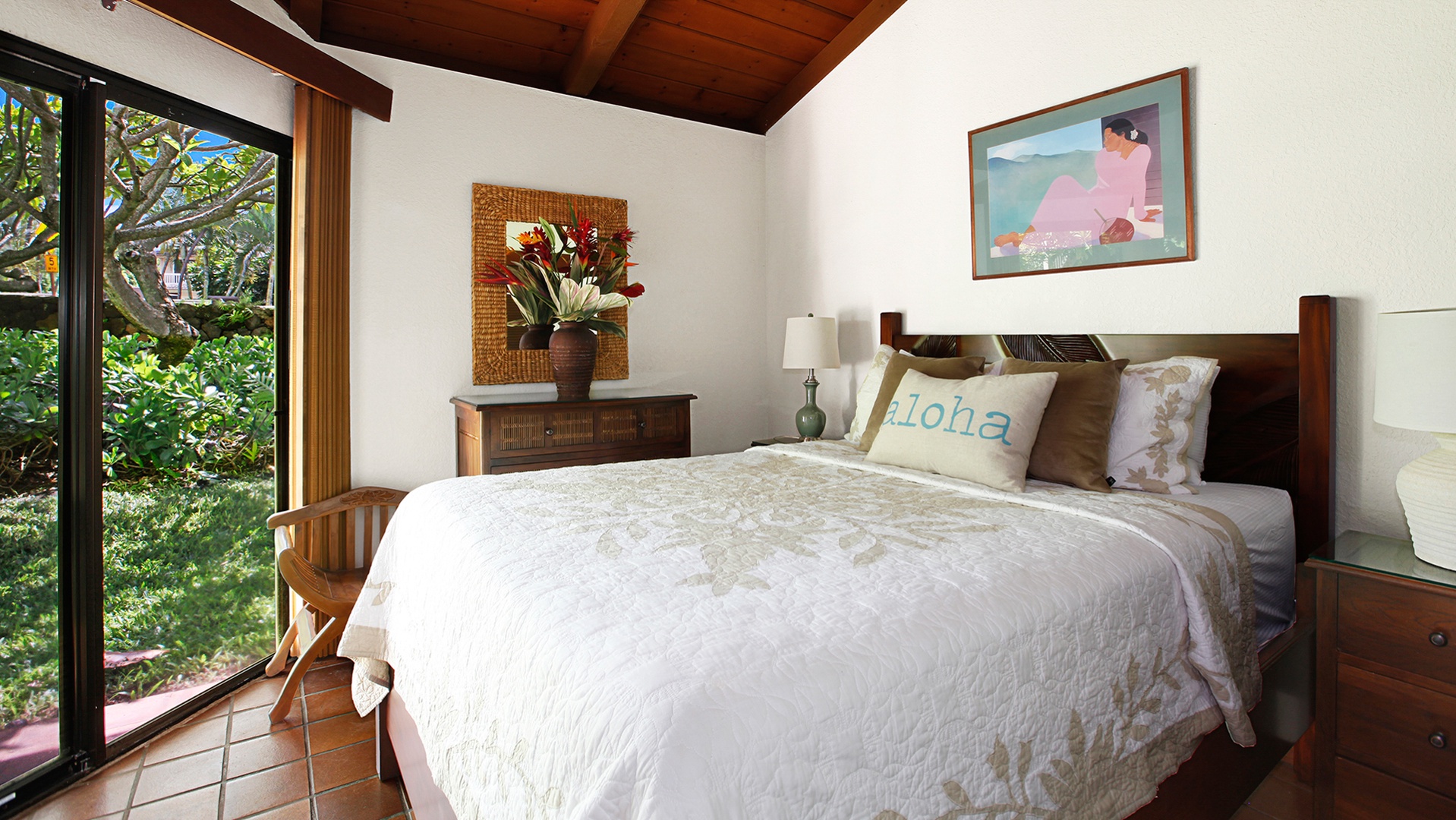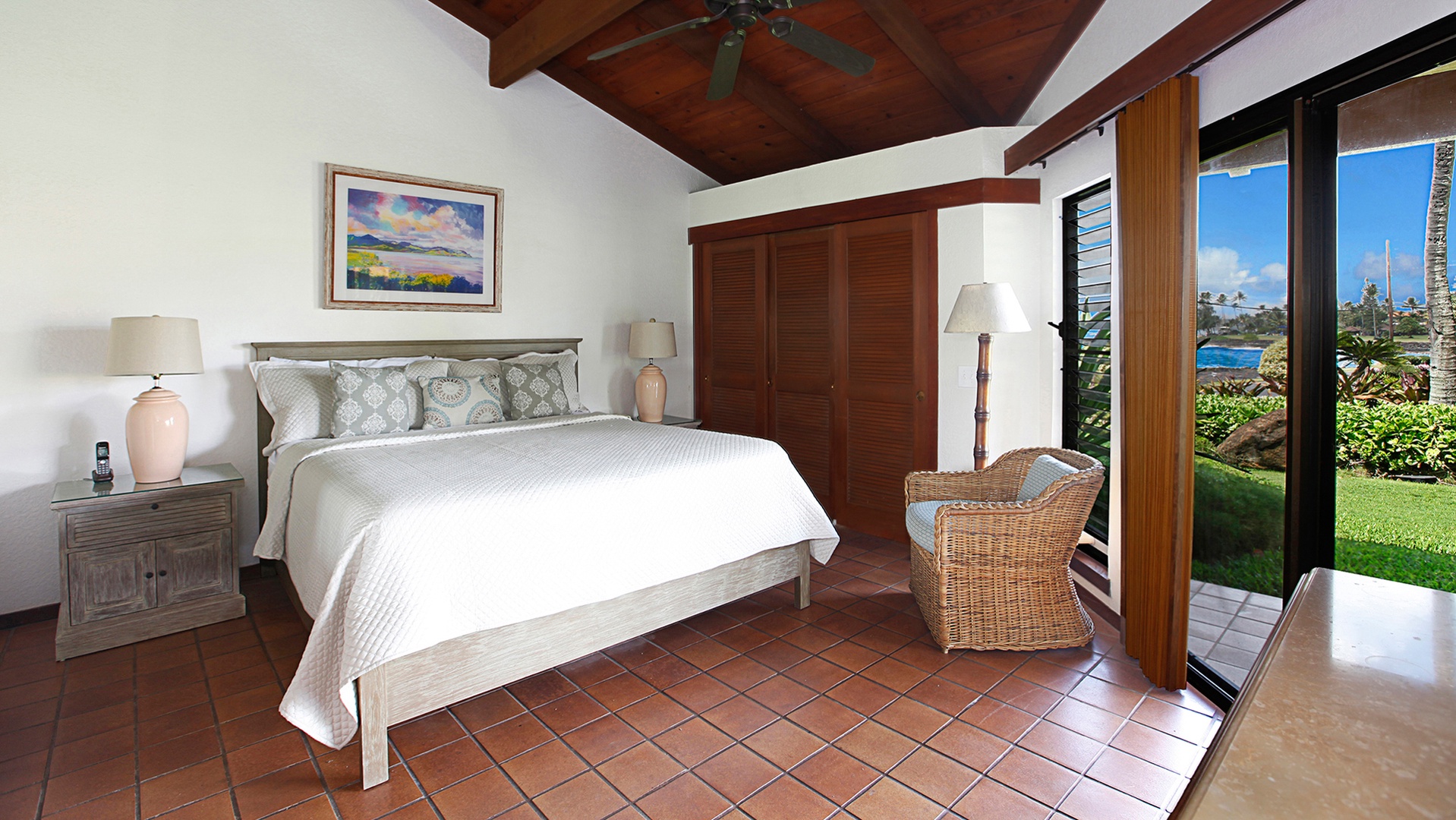 • Master Suite – ocean view, AC, king bed, TV, full bath with walk-in shower, access to lanai