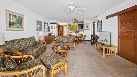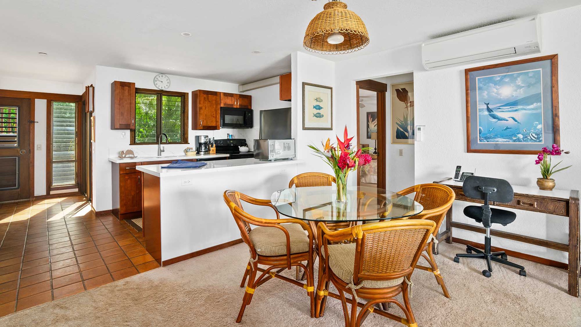 Great view, that’s the best part of our rental. It is close to the beach and not too long of a walk but coming back is a work out after a day in the sun. The last hill to building 8 is a good one and then stairs. There was everything that we needed in the kitchen although someone commented that it looked like everything was purchased at a thrift store. The window screens and window frames could use some cleaning and a furniture update would be good. We did have a great time and were only there in the morning and evening. At about 5pm the sun shines on the lanai and it gets really hot in the house. The shades help a bit and if you open the front door and turn on all the fans it’s not too bad