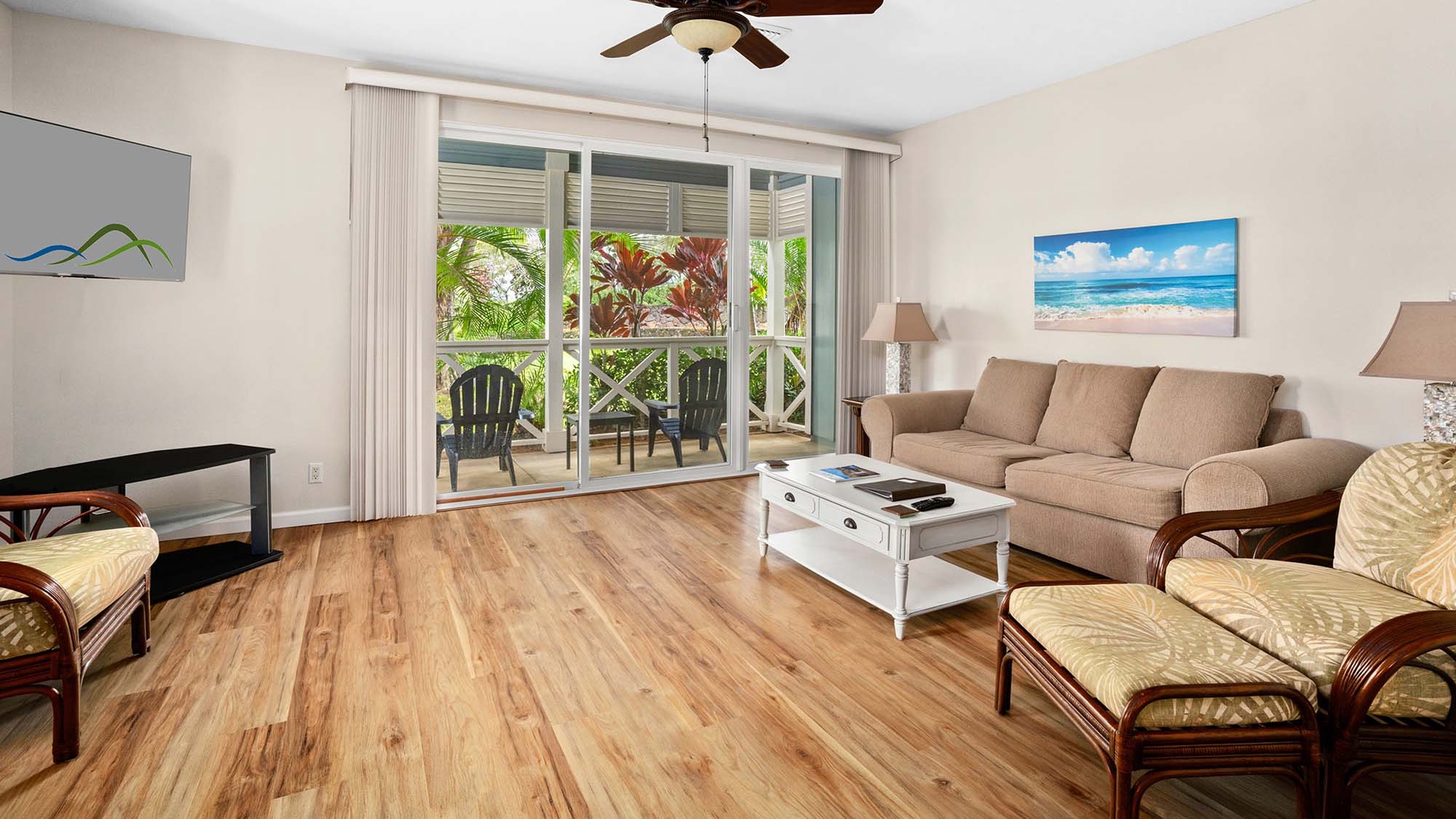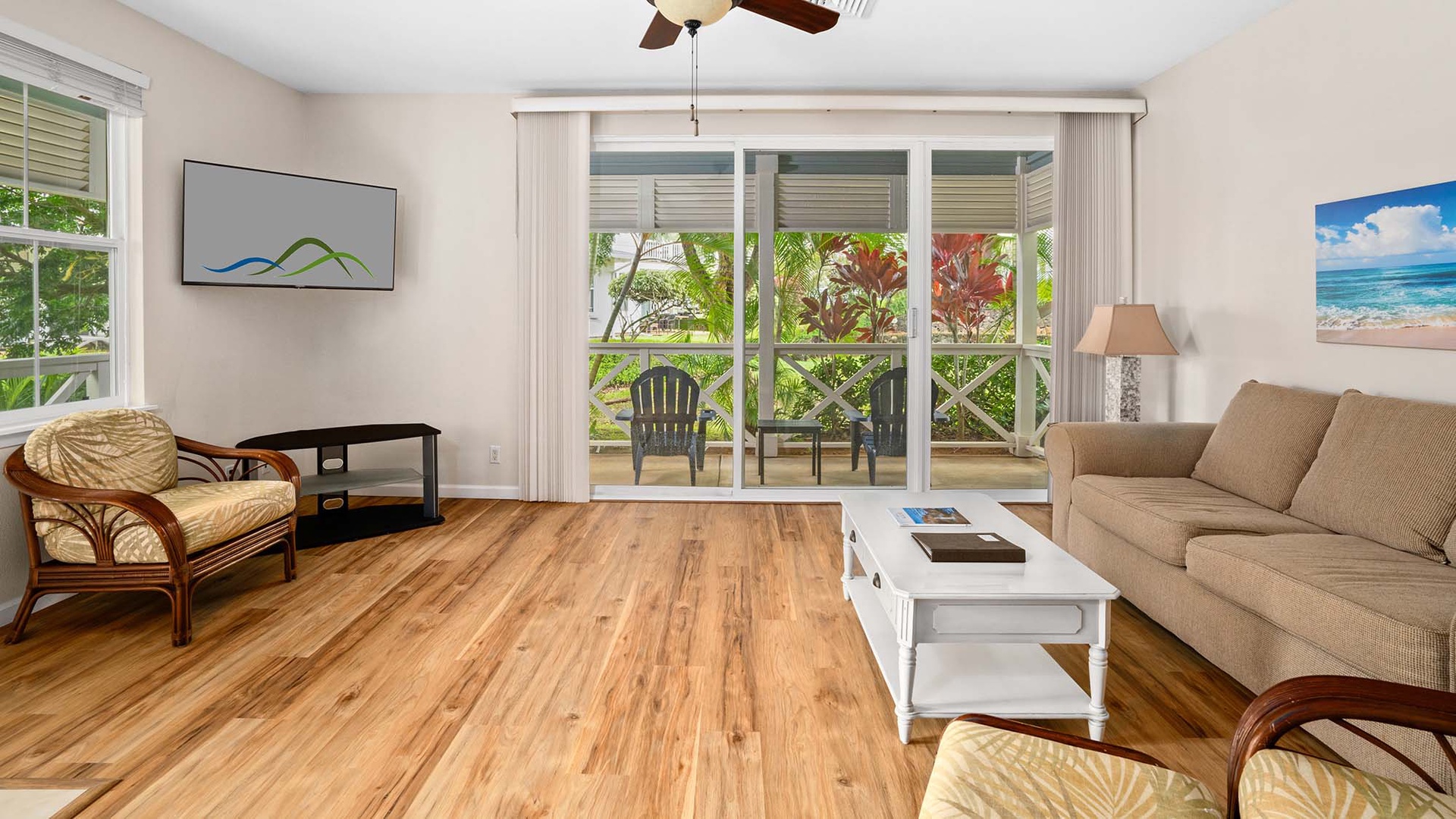 • Living room – Large flat screen TV/DVD, covered private lanai, AC
