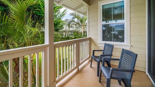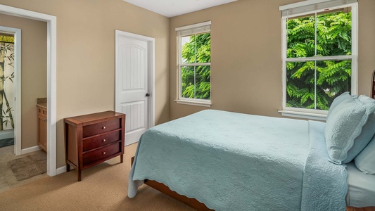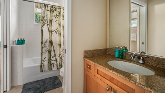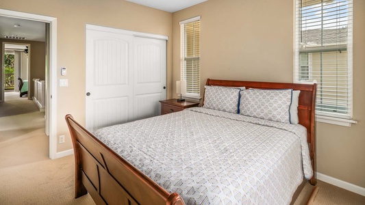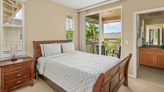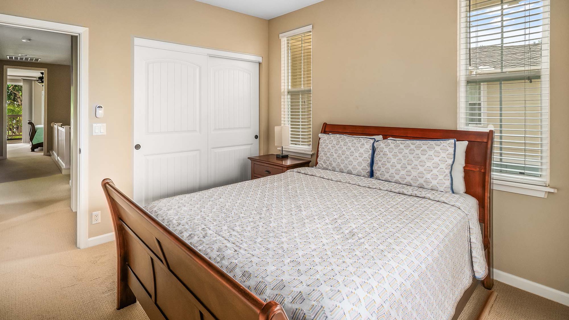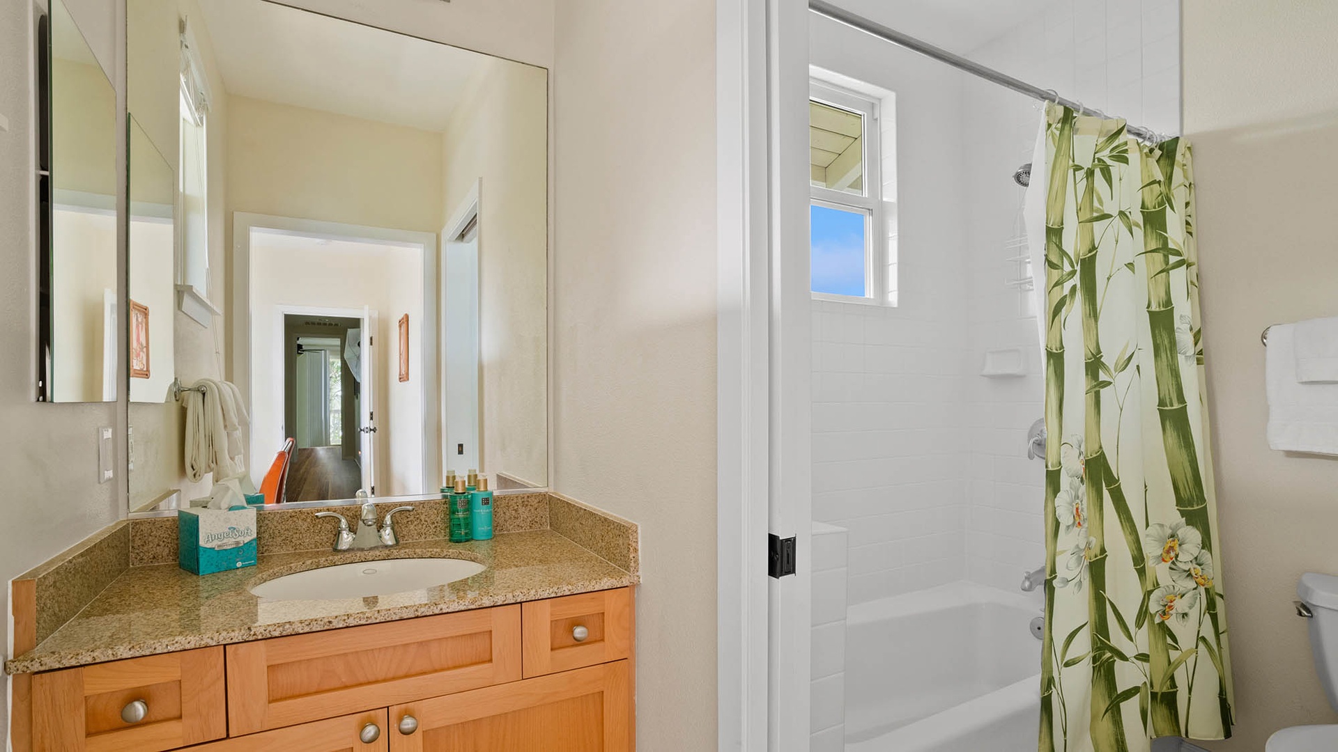 • Second Bedroom – upper level, queen bed, flat screen TV, shared full bath tub with shower combination, private vanity, private lanai, AC