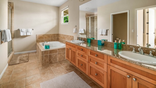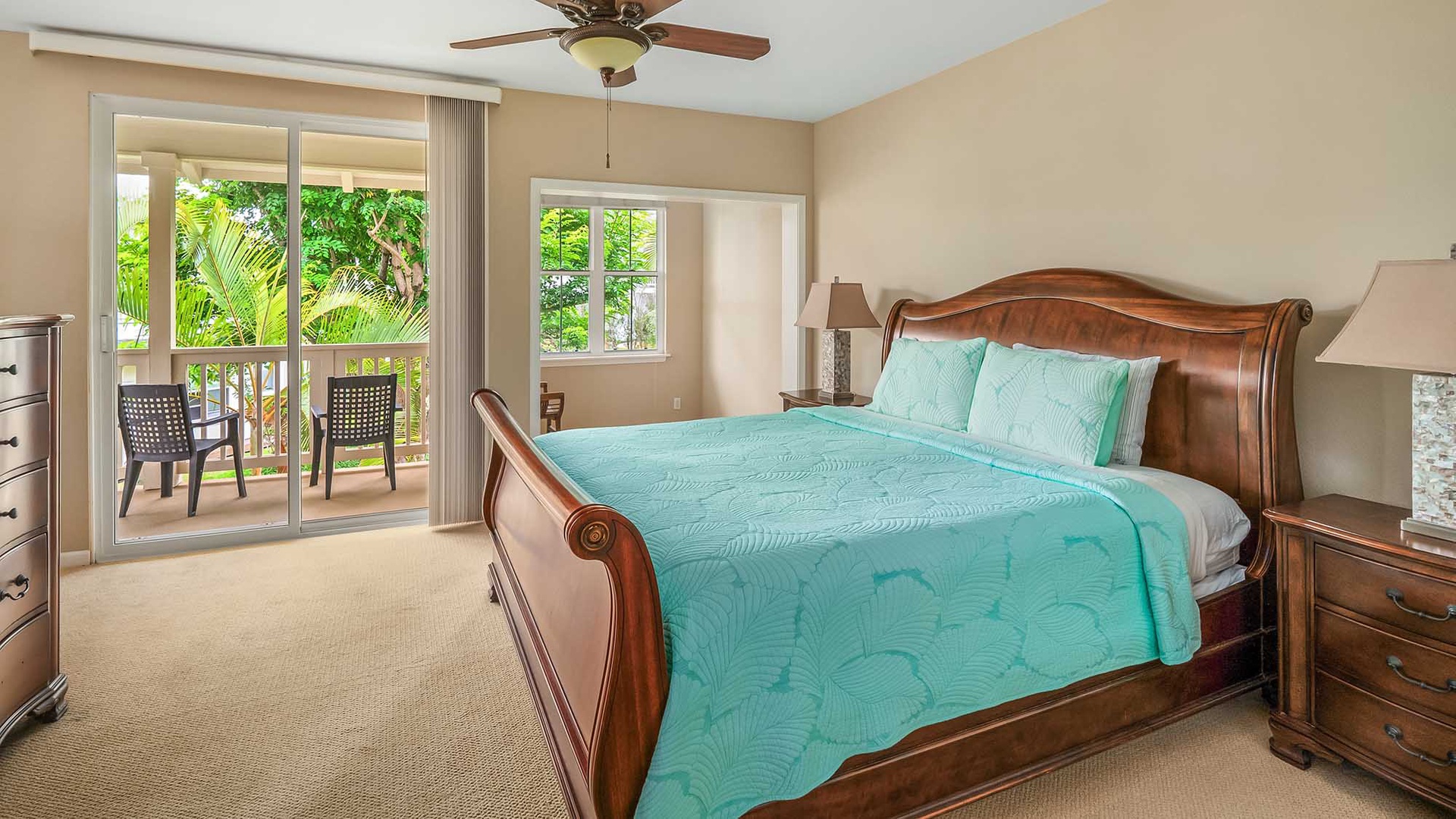 • Master Bedroom Suite – upper level, king bed, flat screen TV, private lanai, executive desk area, full bath with separate tub and walk-in shower, safe, AC