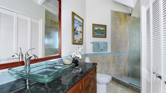 • Master Suite – upper level, king bed, TV, full bath with walk-in shower