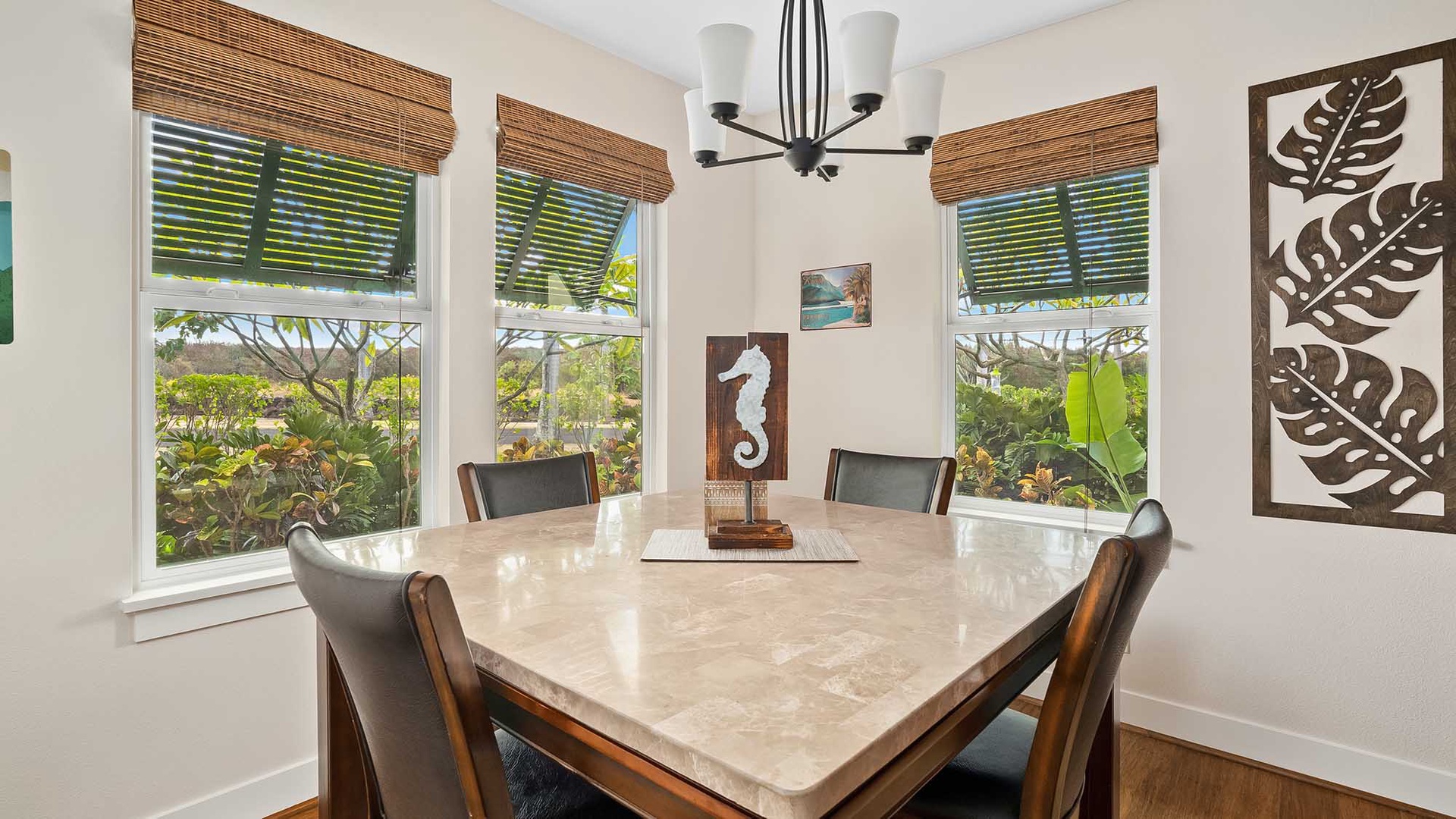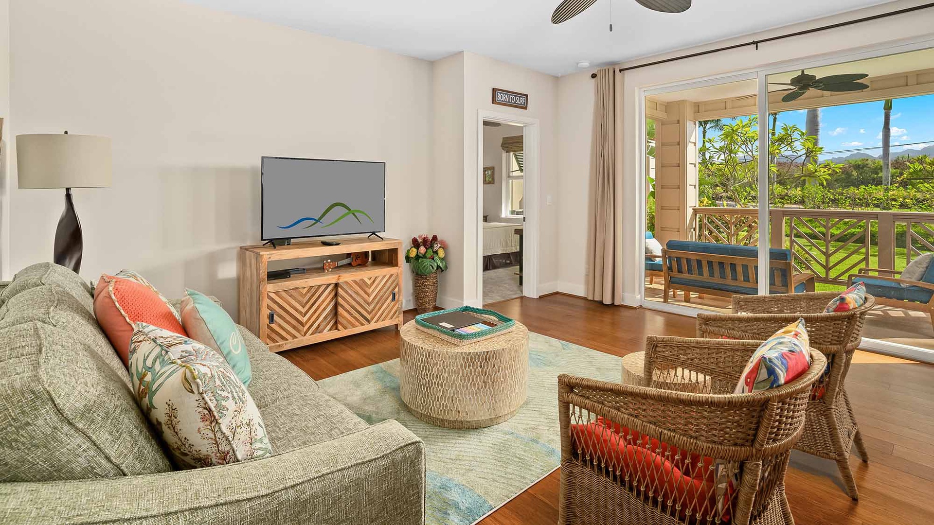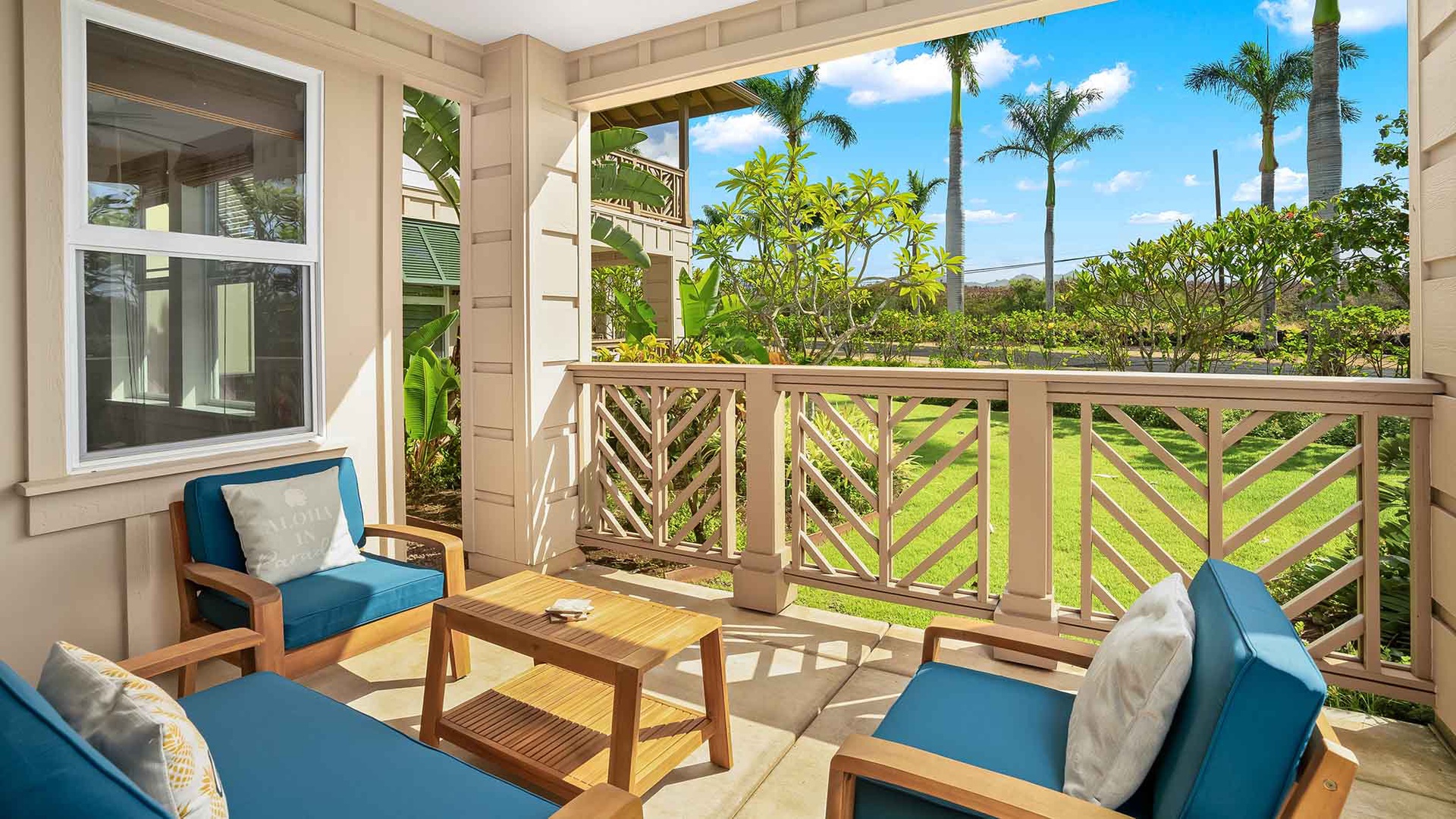 • Great room design – kitchen, dining and living room all with garden and distant mountain views, access to lanai