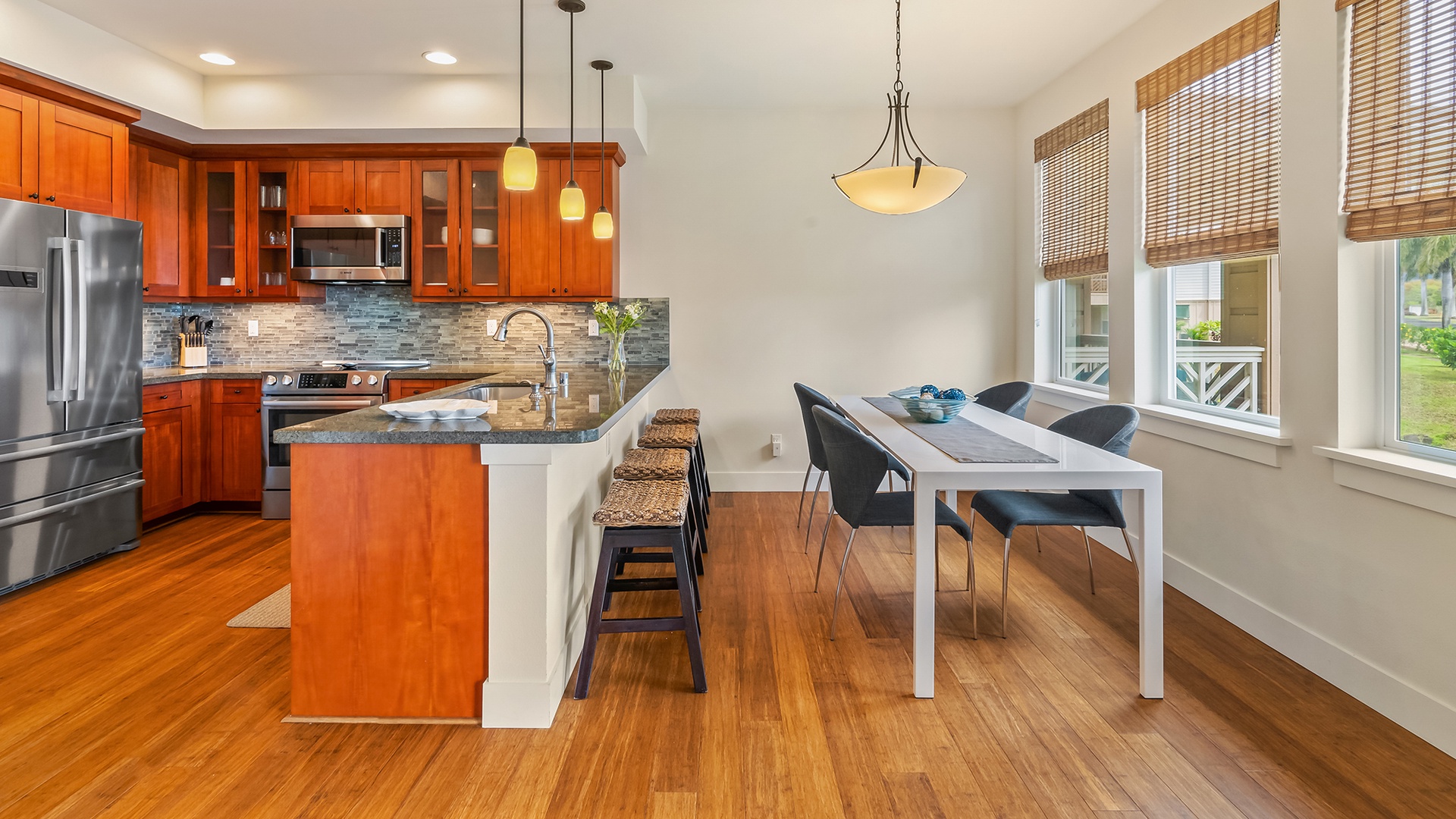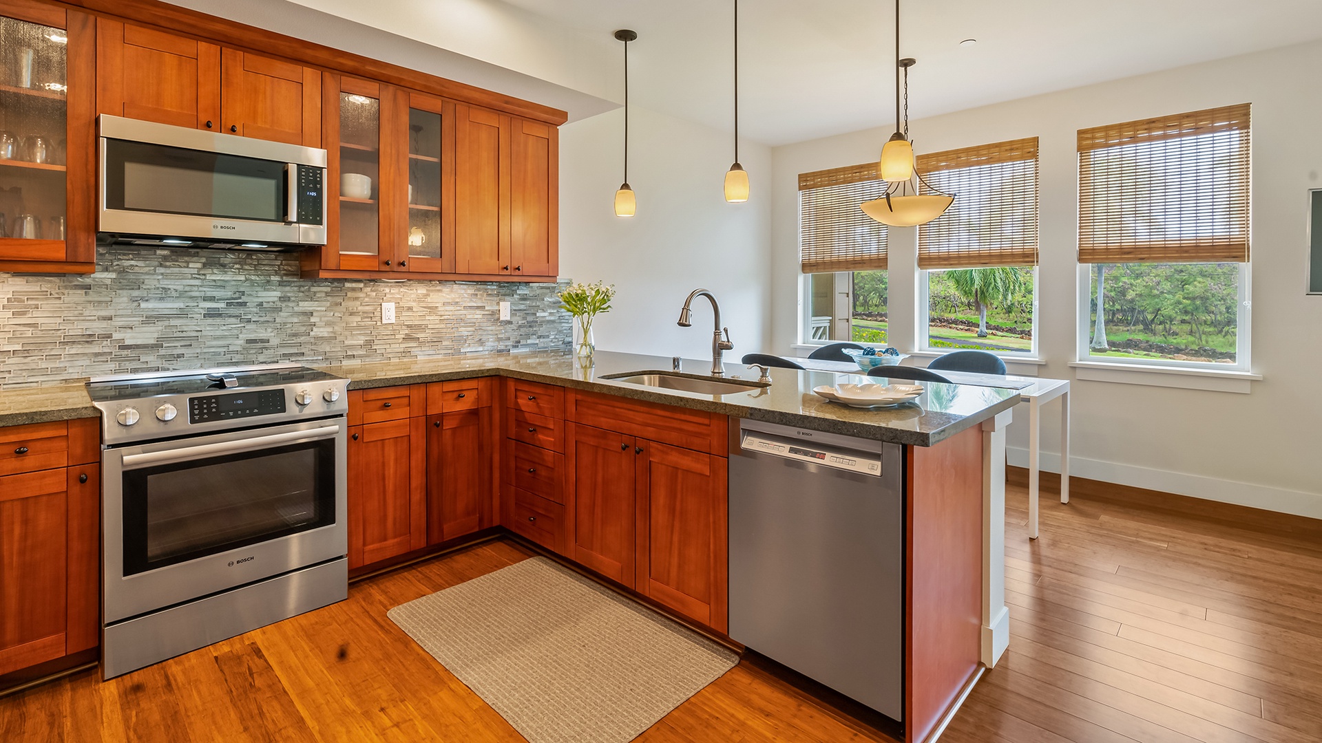 • Great room design – kitchen, dining and living room all with garden and distant mountain views, access to lanai