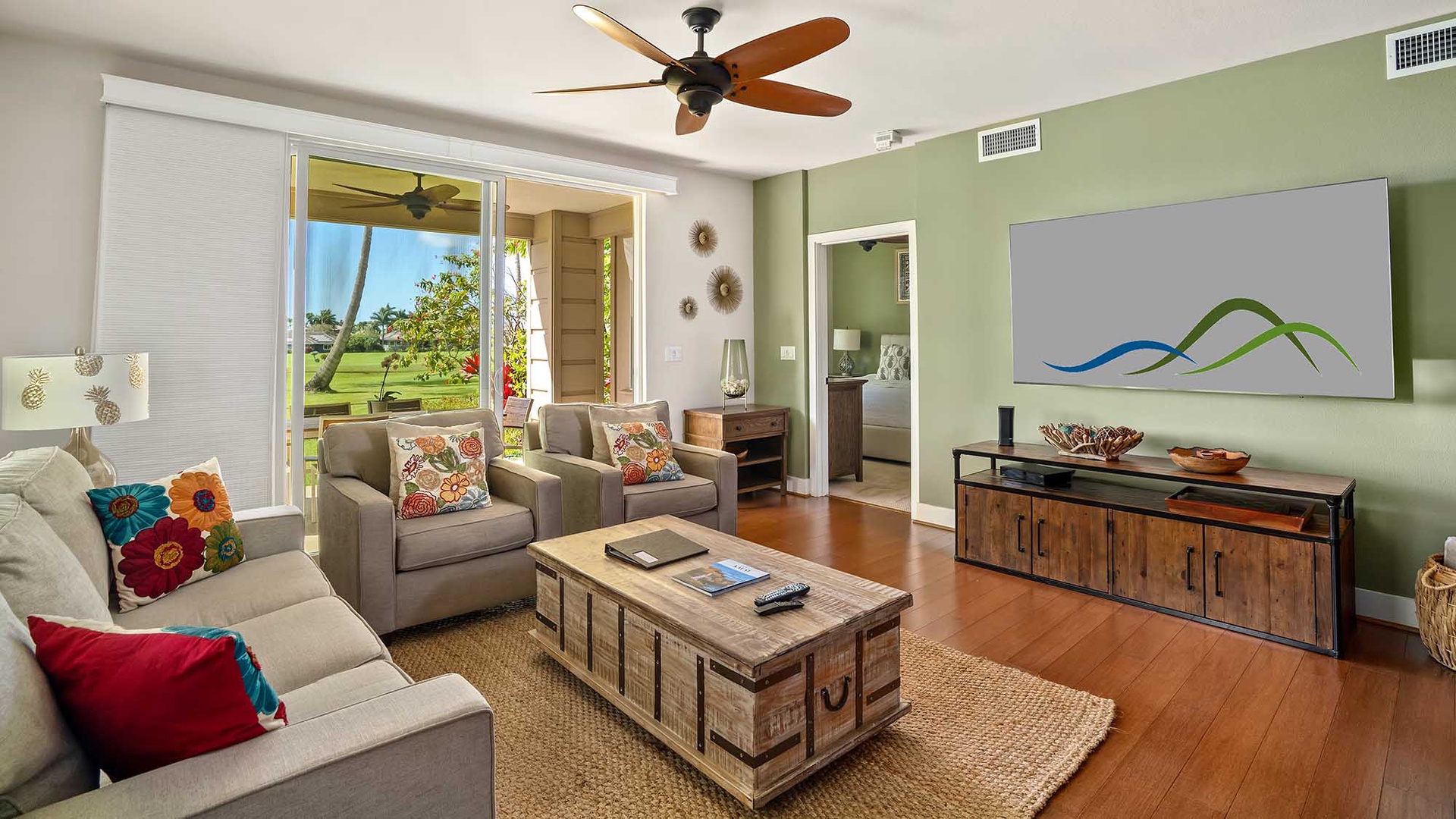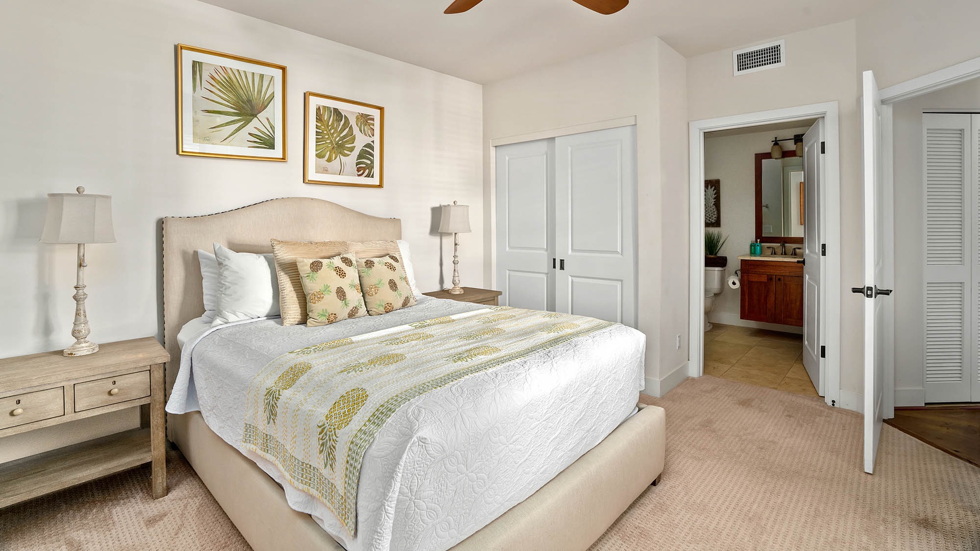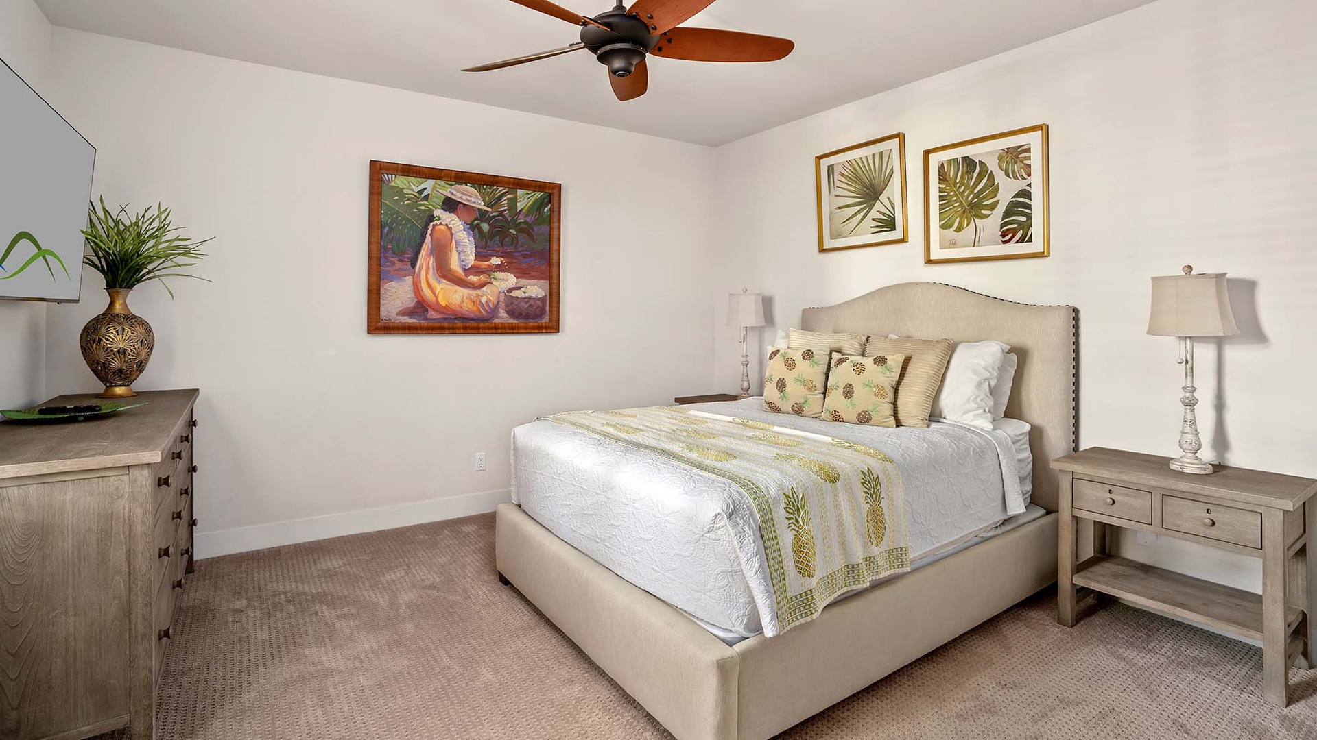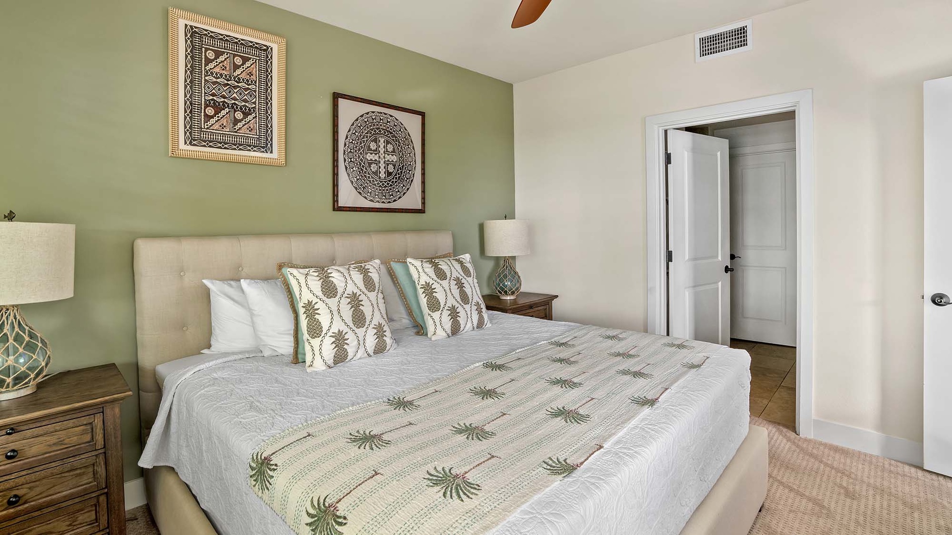 • Master Bedroom Suite – King bed, TV, full bath with walk-in shower, double vanity, large walk-in closet, access to shared lanai