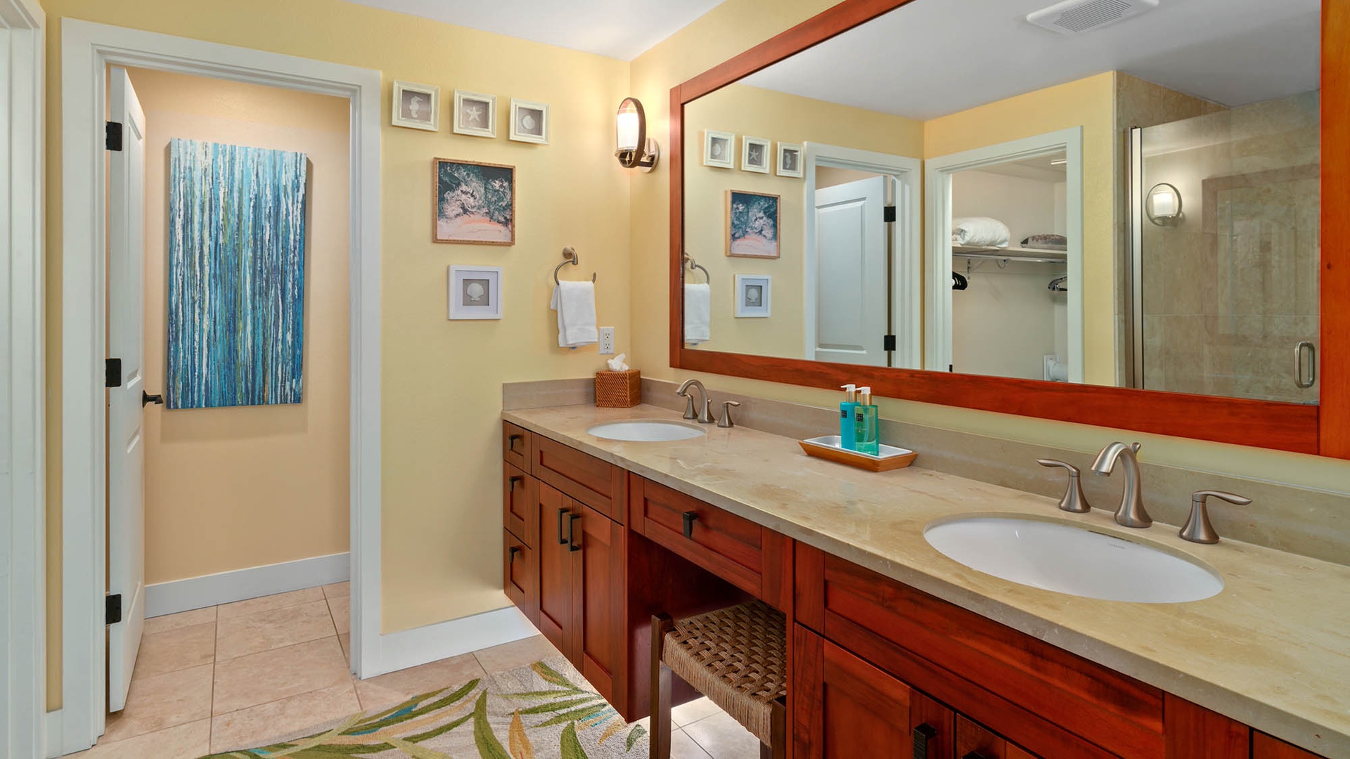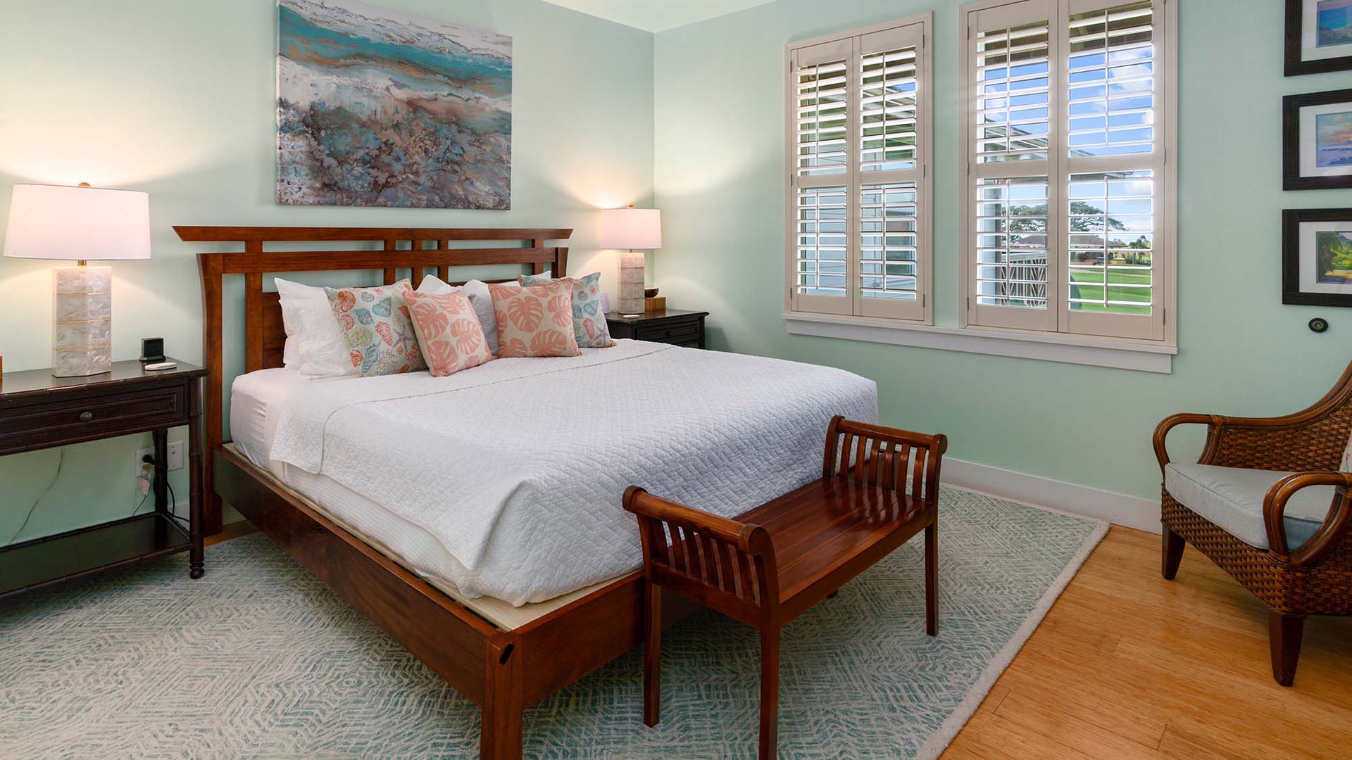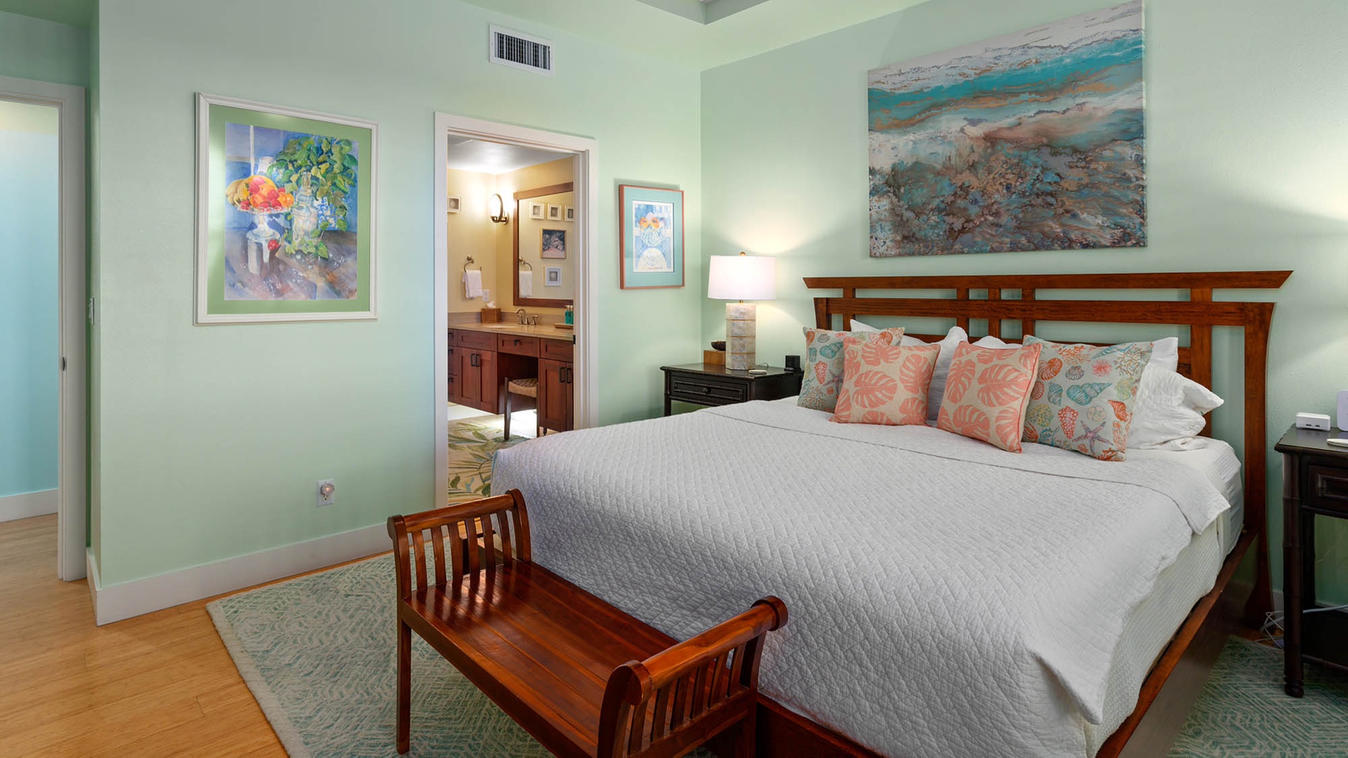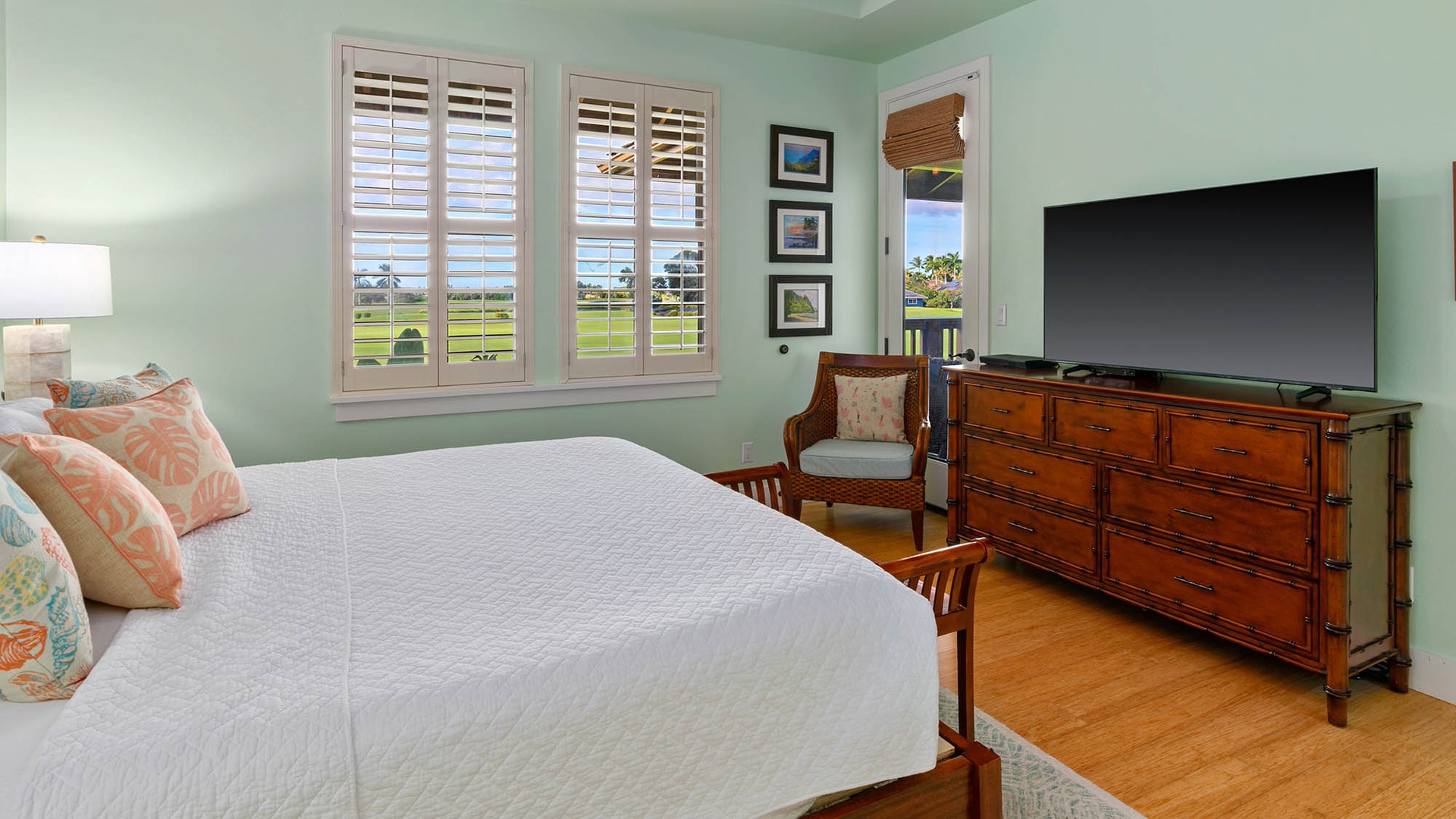 • Master Bedroom Suite – king bed, TV, full bath with walk-in shower, double vanity, walk-in closet, access to lanai