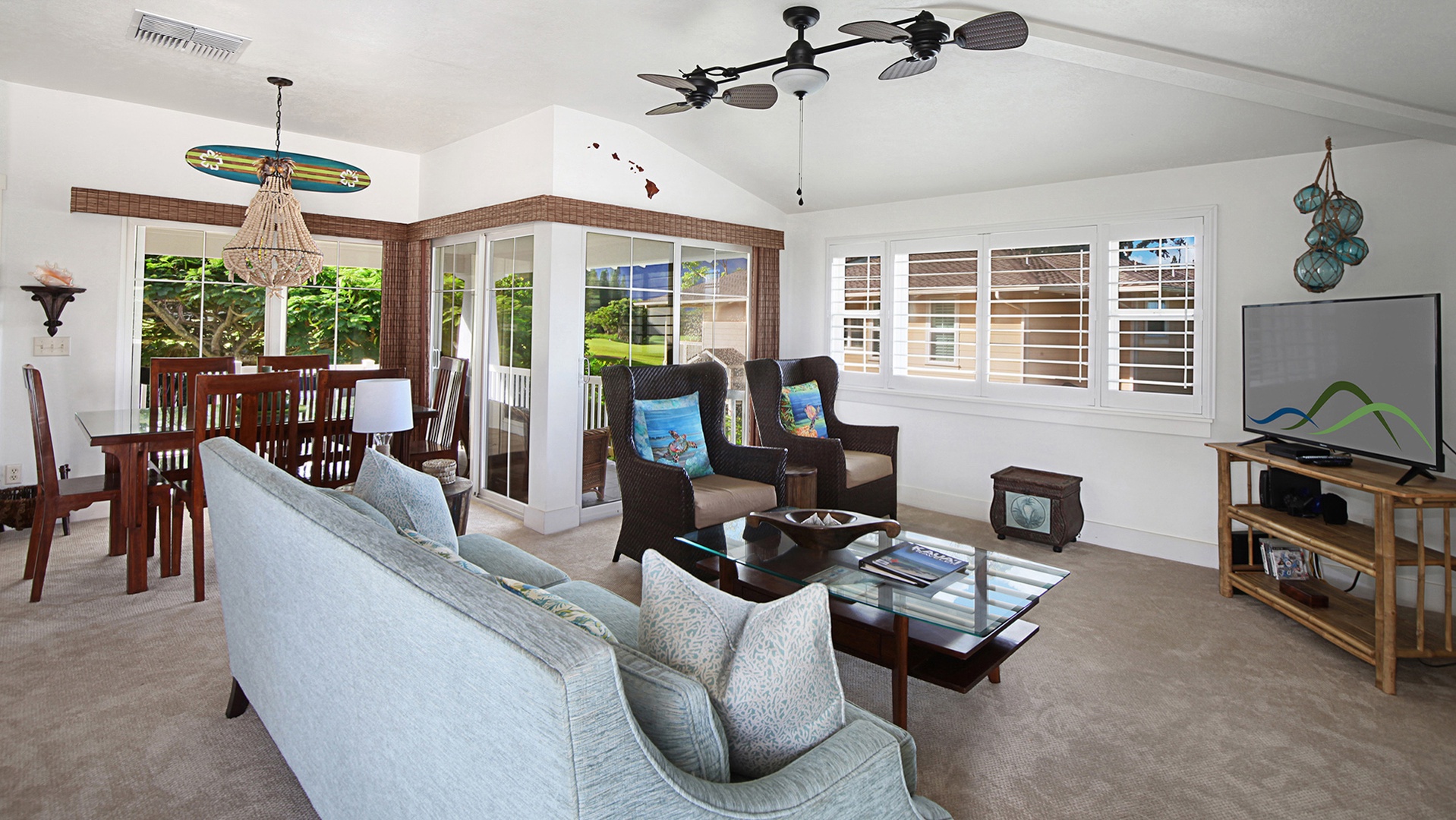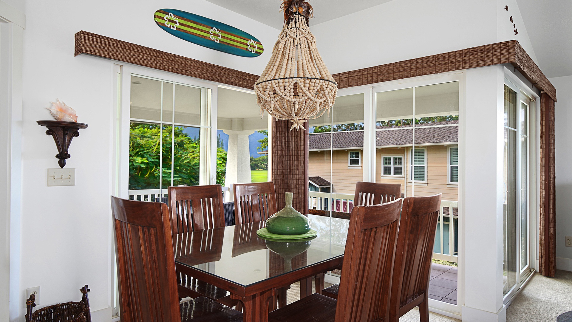 The deck view overlooking the golf grounds and mountains beyond is stupendous!..Parrish mngt was quick to replace missing beach chairs...9 minutes to our favorite beach Anini. The kitchen pots and pans are needed to be replaced and deck cushions as well..we will be back next year!