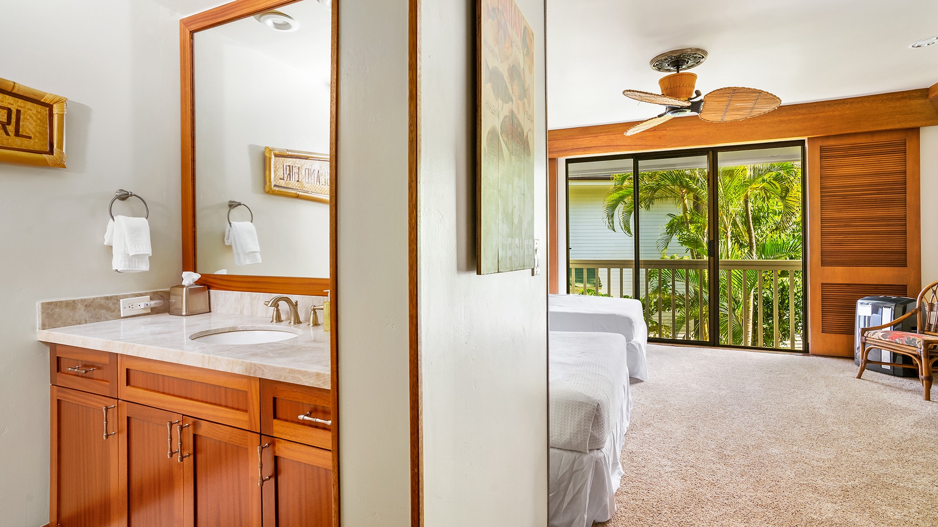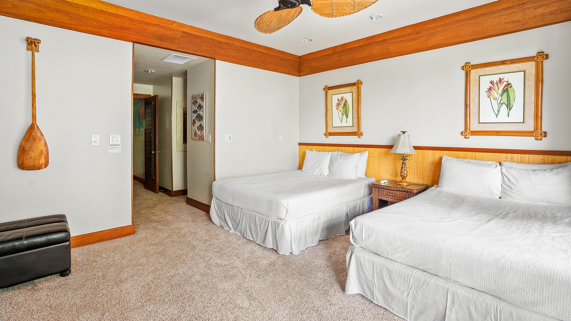 • Second Suite – garden view, AC, two queen beds, flat screen TV, full bath with walk-in shower