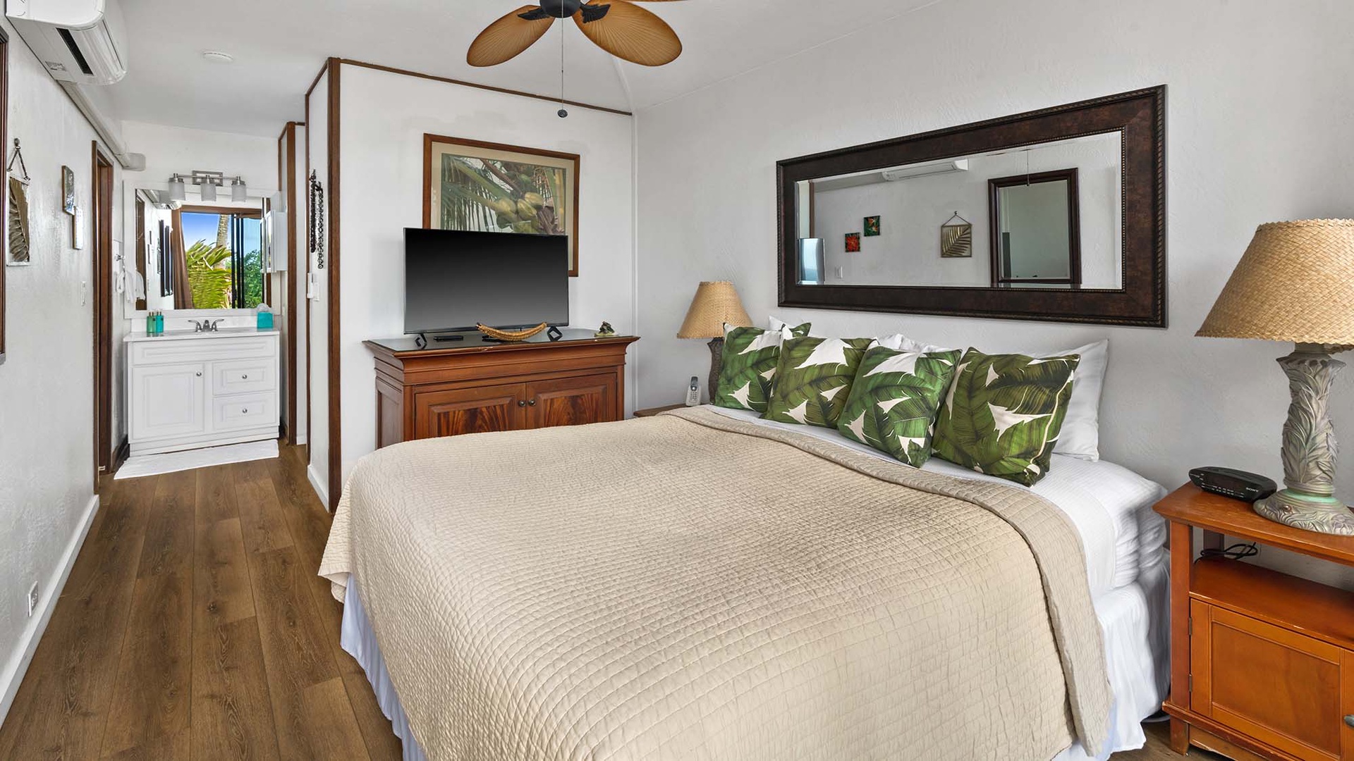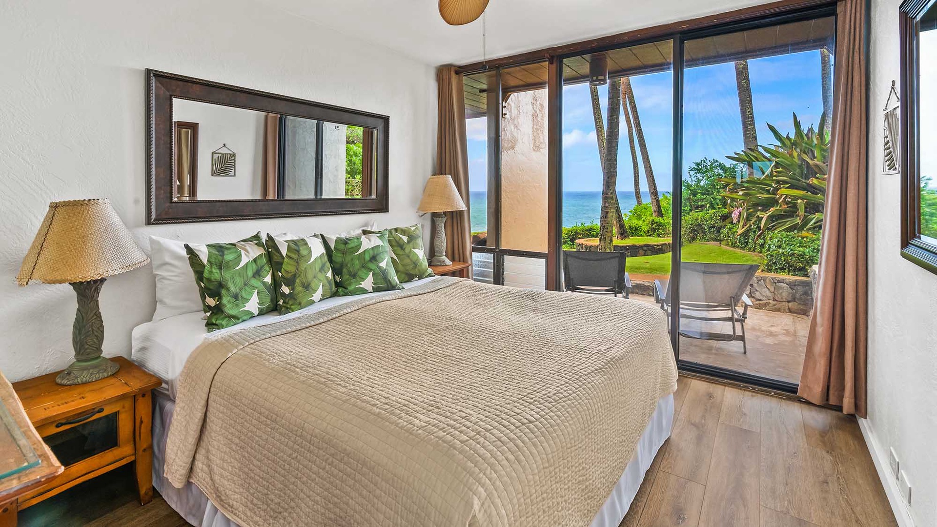 • Master Bedroom Suite – king bed, AC, ocean view, TV, full bath with shower, oceanfront lanai and lawn