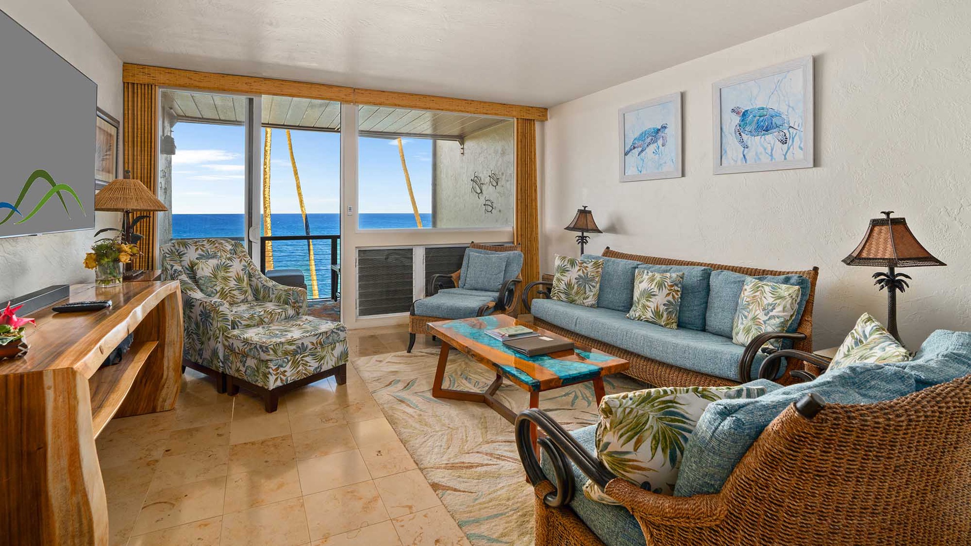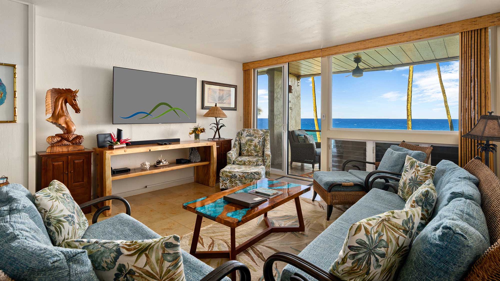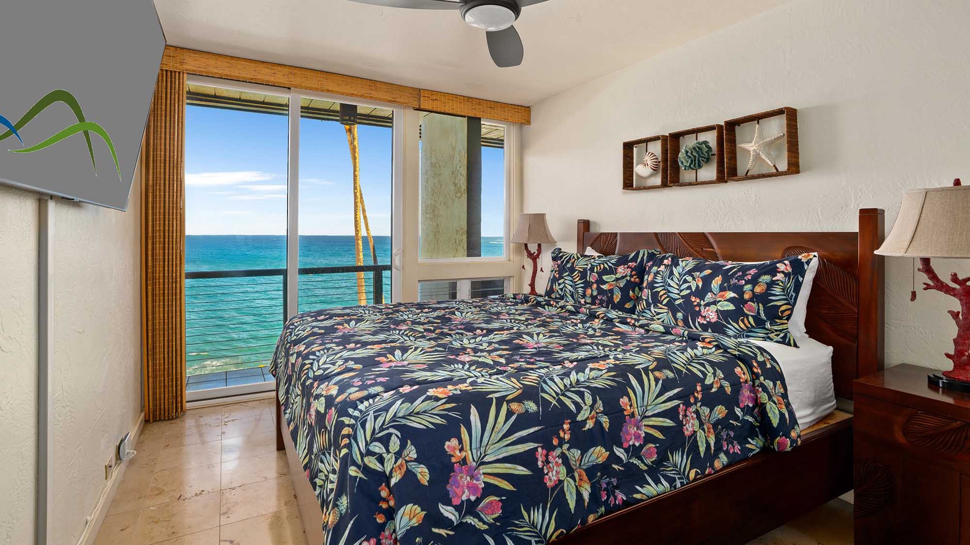 • Master Bedroom Suite – king bed, AC, ocean view, full bath with walk-in shower, oceanfront lanai, 60 inch TV streaming service only